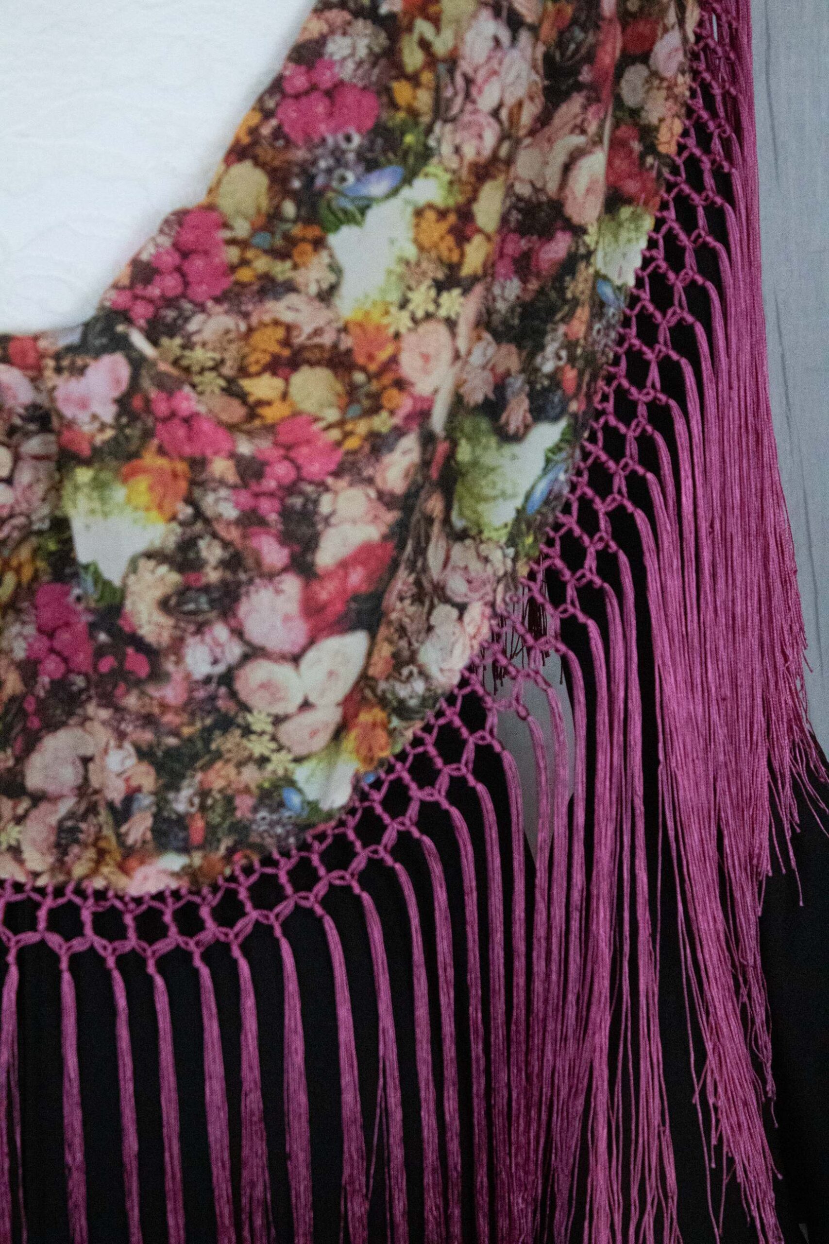 Mantón estampado de flores, acabado en enrejado maquillaje oscuro.
