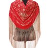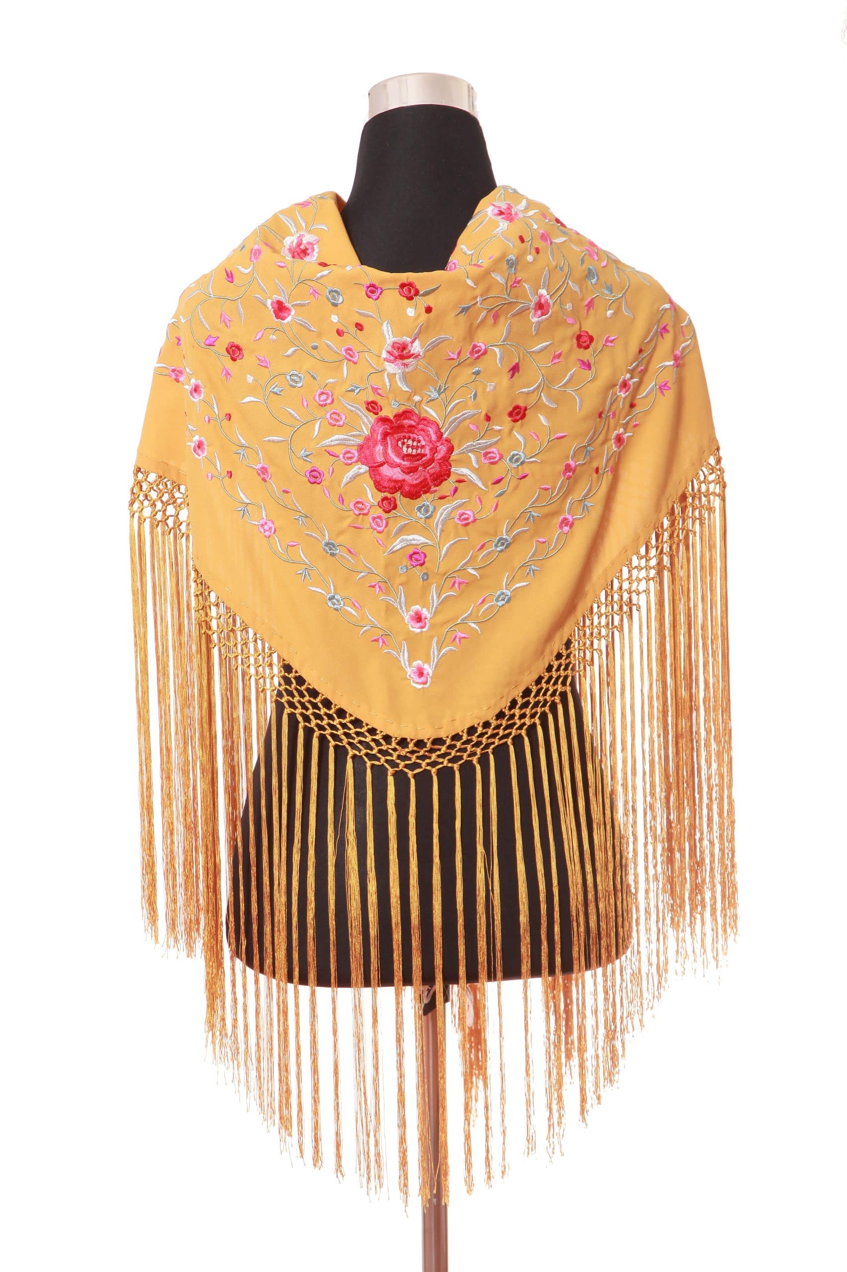 Mantón color albero bordado en multicolor de algodón flecado en mano con borlón en seda y enrejado en seda natural. Medidas 135x60cm aprox. (Sólo el mantón) más los flecos 25 cm (incluyendo el enrejado). Fabricado artesanalmente en la provincia de Sevilla.
