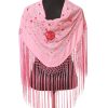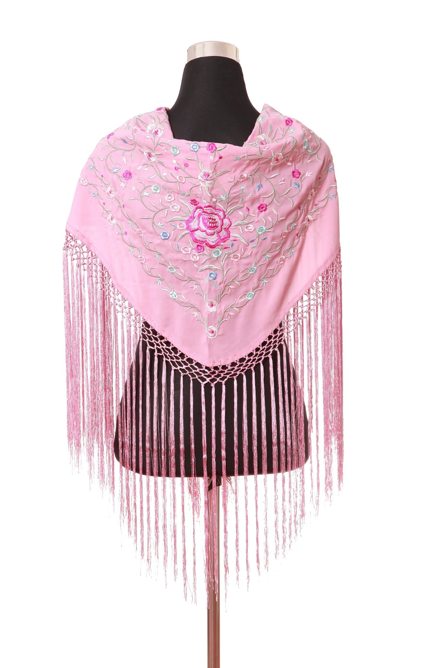 Mantón color maquillaje bordado en multicolor de algodón flecado en mano con borlón en seda y enrejado en seda natural. Medidas 135x60cm aprox. (Sólo el mantón) más los flecos 25 cm (incluyendo el enrejado). Fabricado artesanalmente en la provincia de Sevilla.