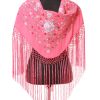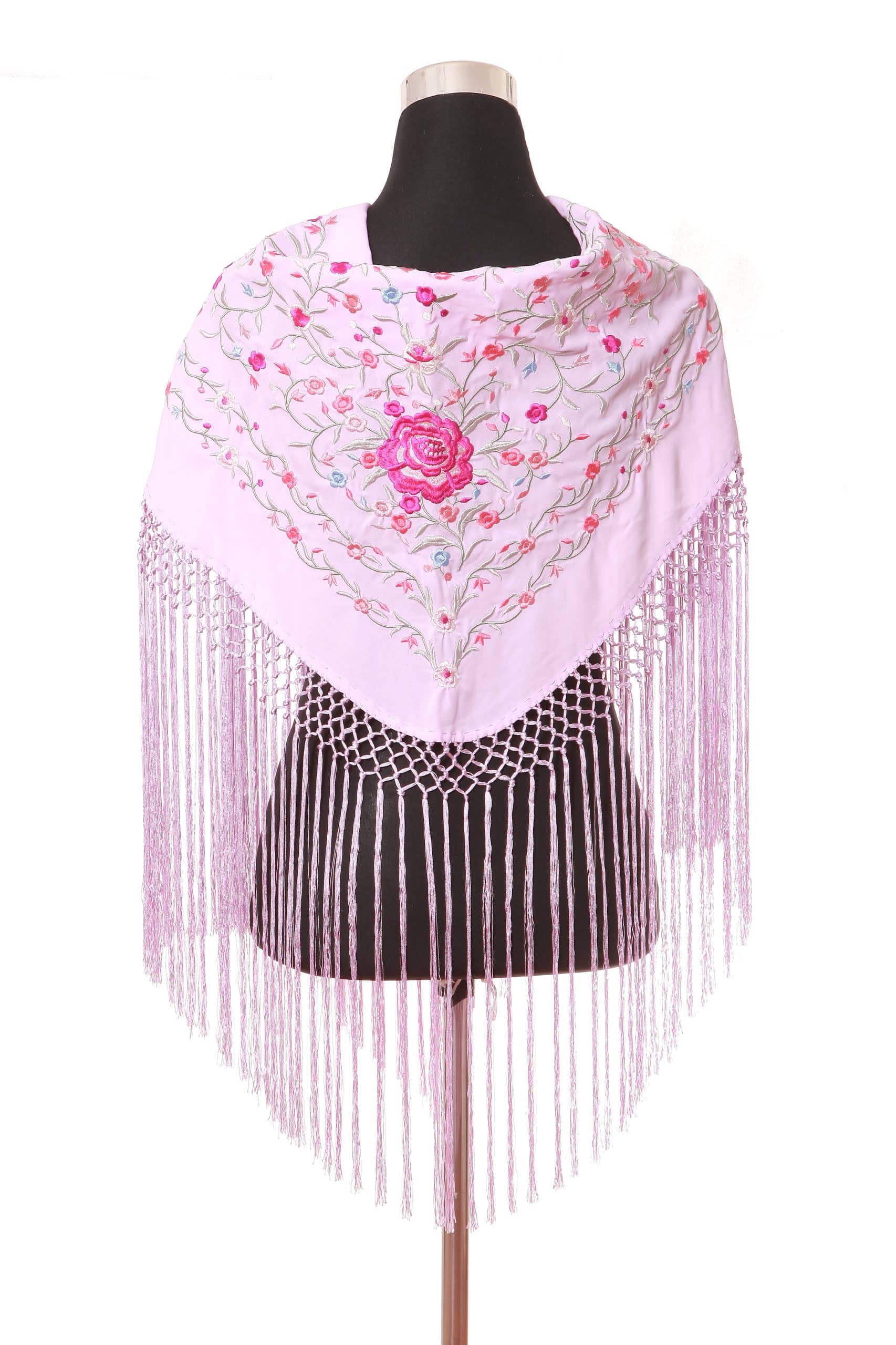Mantón color rosa bebé bordado en multicolor de algodón flecado en mano con borlón en seda y enrejado en seda natural. Medidas 135x60cm aprox. (Sólo el mantón) más los flecos 25 cm (incluyendo el enrejado). Fabricado artesanalmente en la provincia de Sevilla.