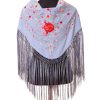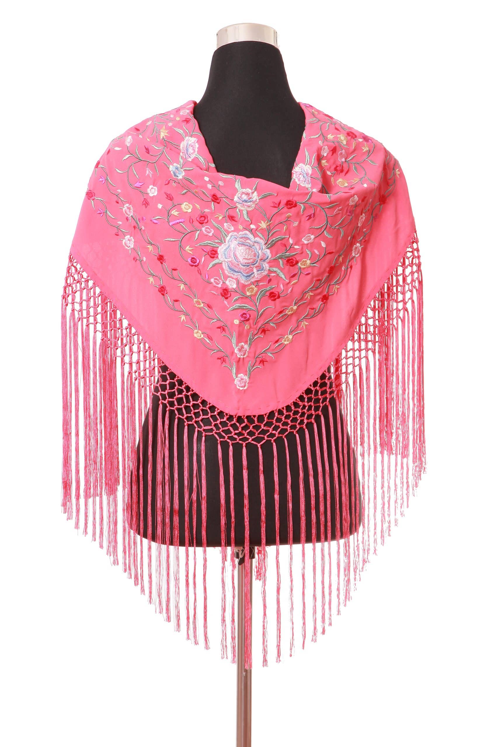 Mantón color rosa fresa bordado en multicolor de algodón flecado en mano con borlón en seda y enrejado en seda natural. Medidas 135x60cm aprox. (Sólo el mantón) más los flecos 25 cm (incluyendo el enrejado). Fabricado artesanalmente en la provincia de Sevilla.