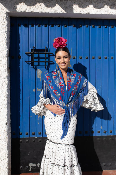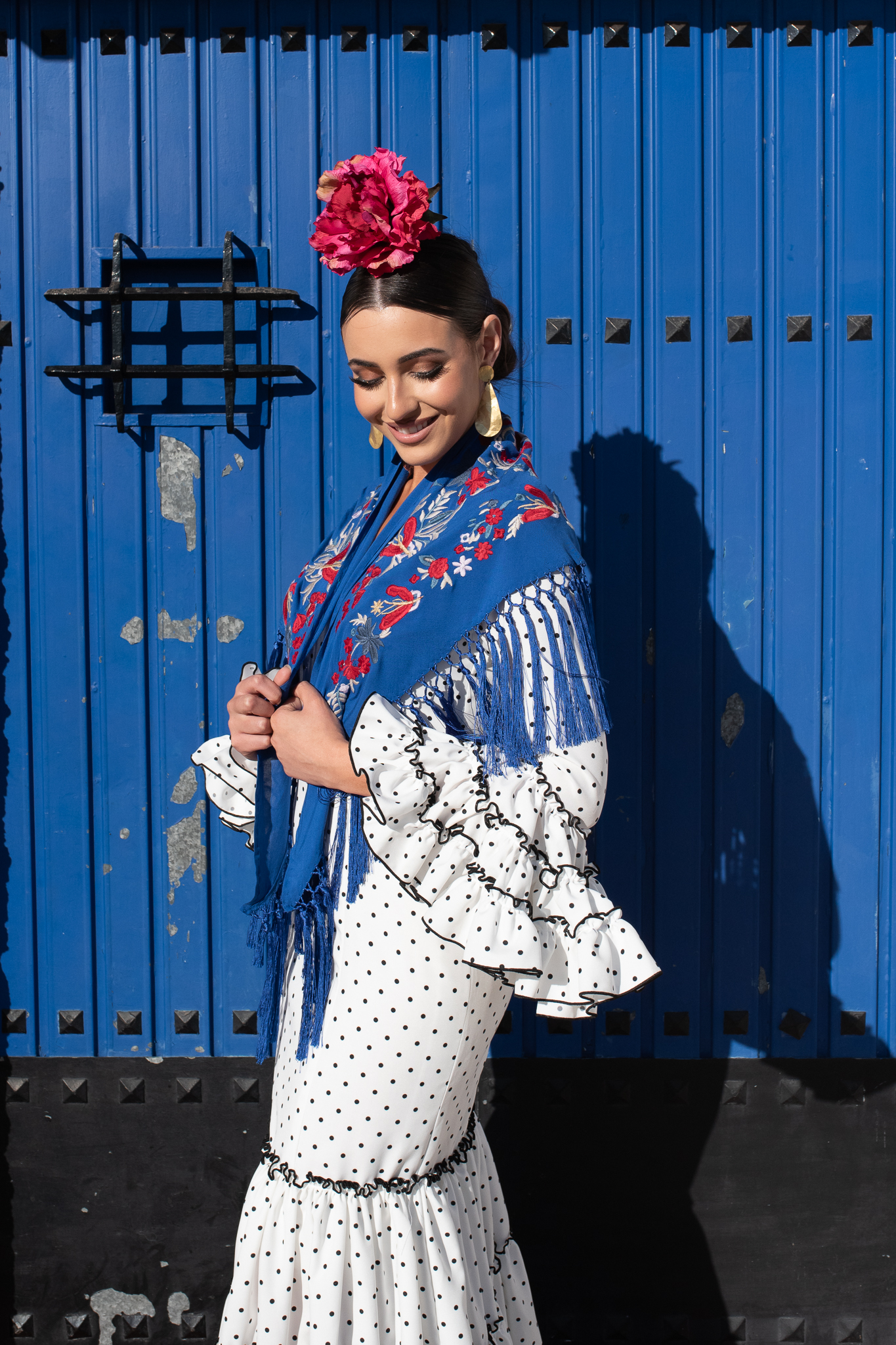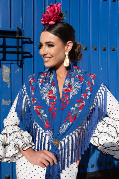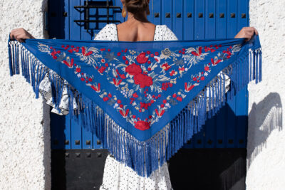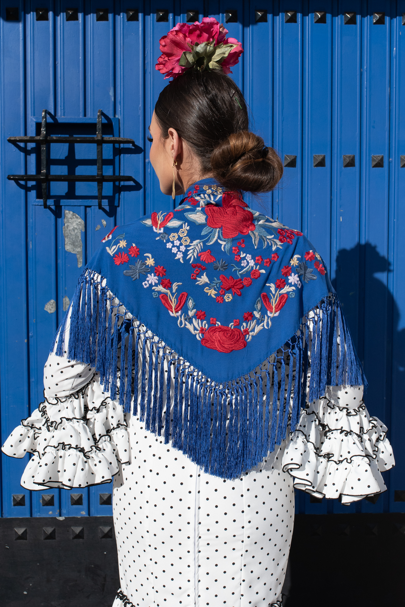 Mantón Gabriela en azulina de algodón con bordado multicolor en hilo mate de seda consiguiendo el efecto envejecido que tanto es tendencia este 2025.