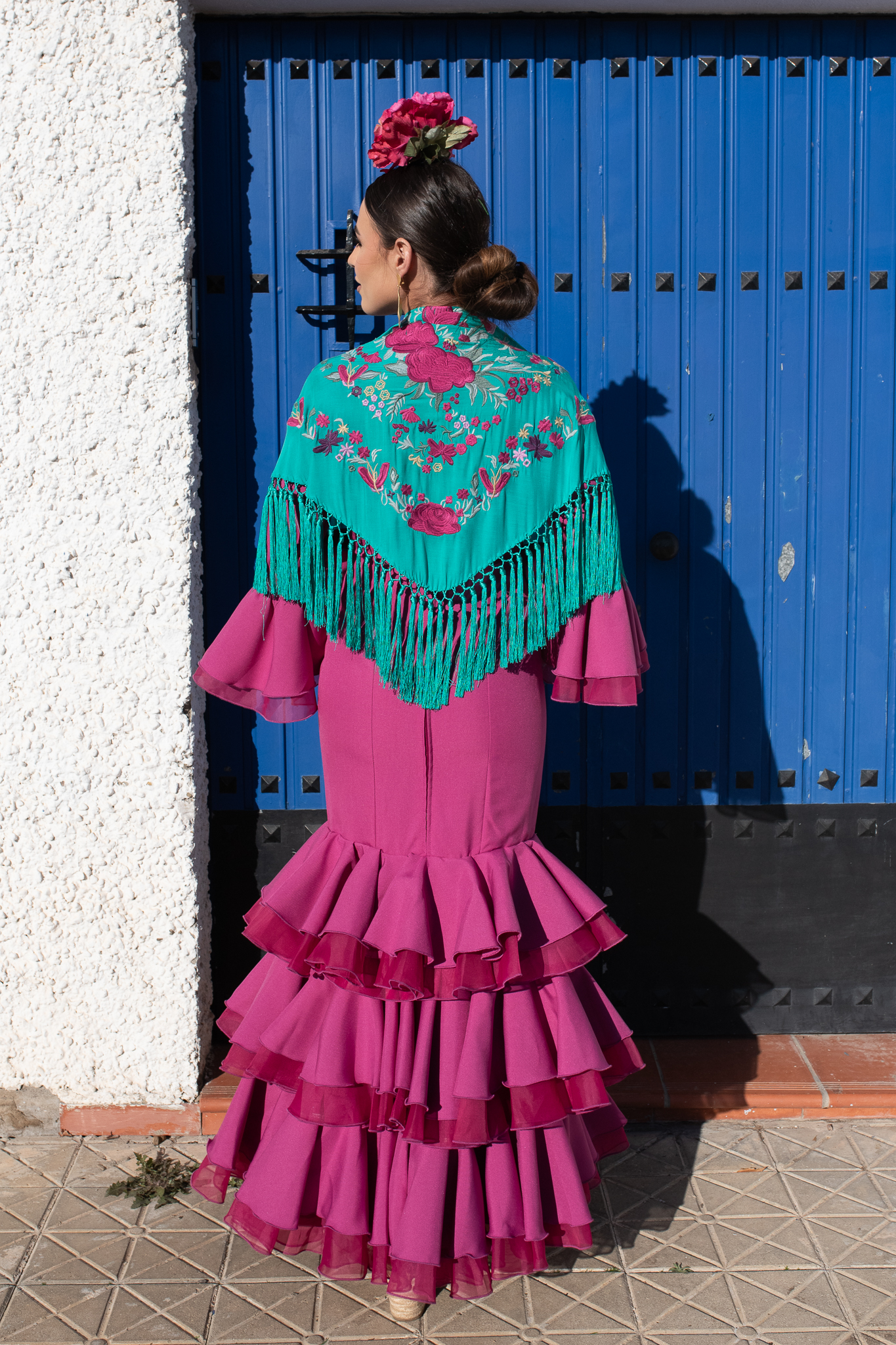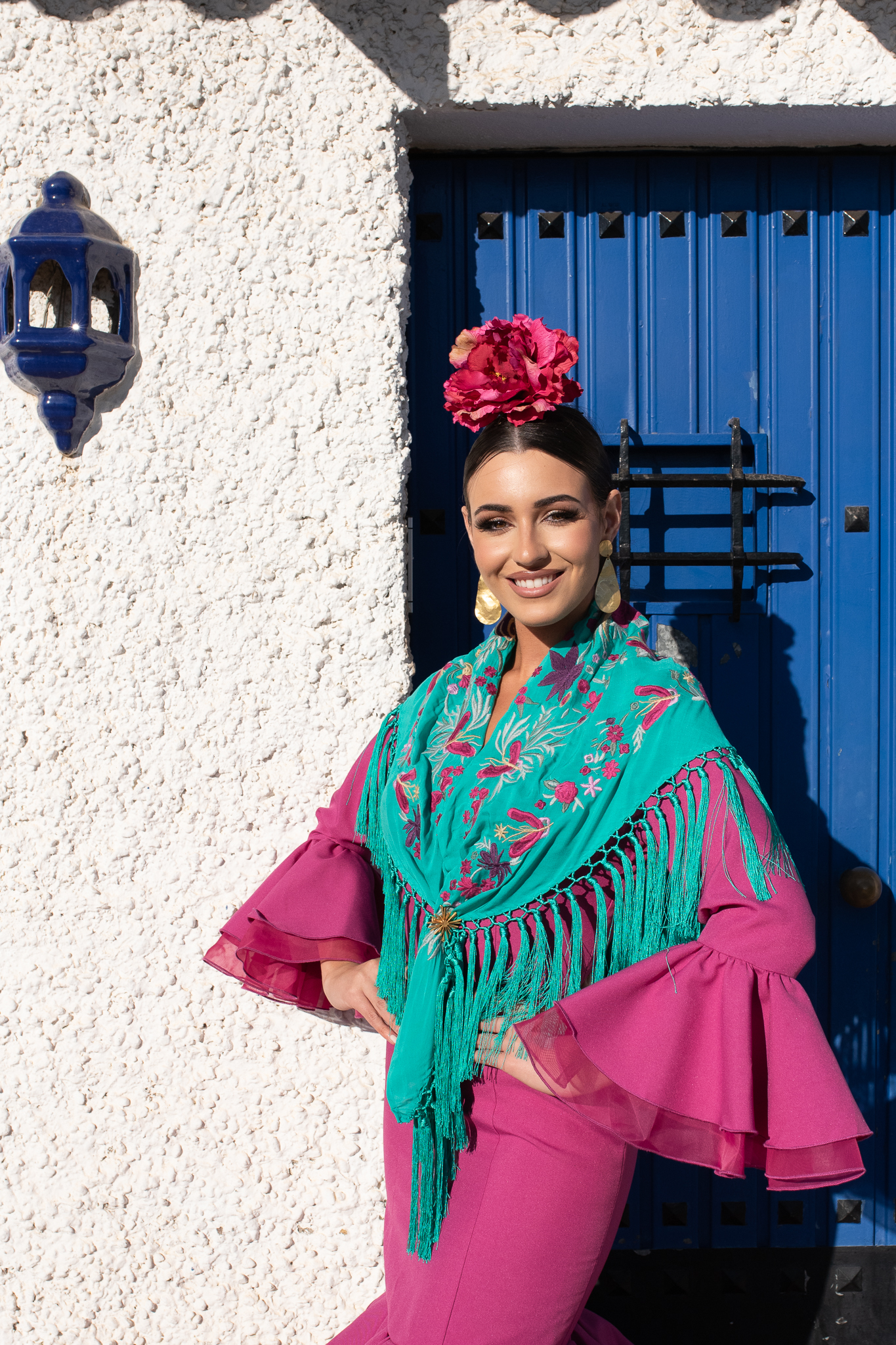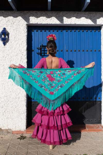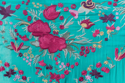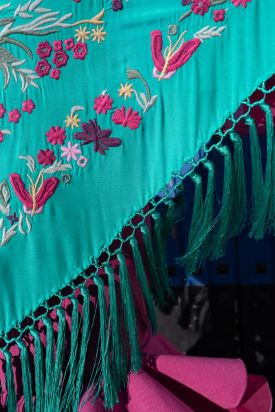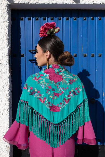 Mantón Gabriela en color Turquesa de algodón con bordado buganvilla en hilo mate de seda consiguiendo el efecto envejecido que tanto es tendencia este 2025.