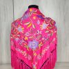 Mantón naranja bordado en multicolor.Enrejado y flecado a mano con seda natural. Medidas 150x66cm aprox. (Sólo el mantón) más los flecos 26 cm (incluyendo el enrejado). Fabricado artesanalmente en la provincia de Sevilla.