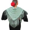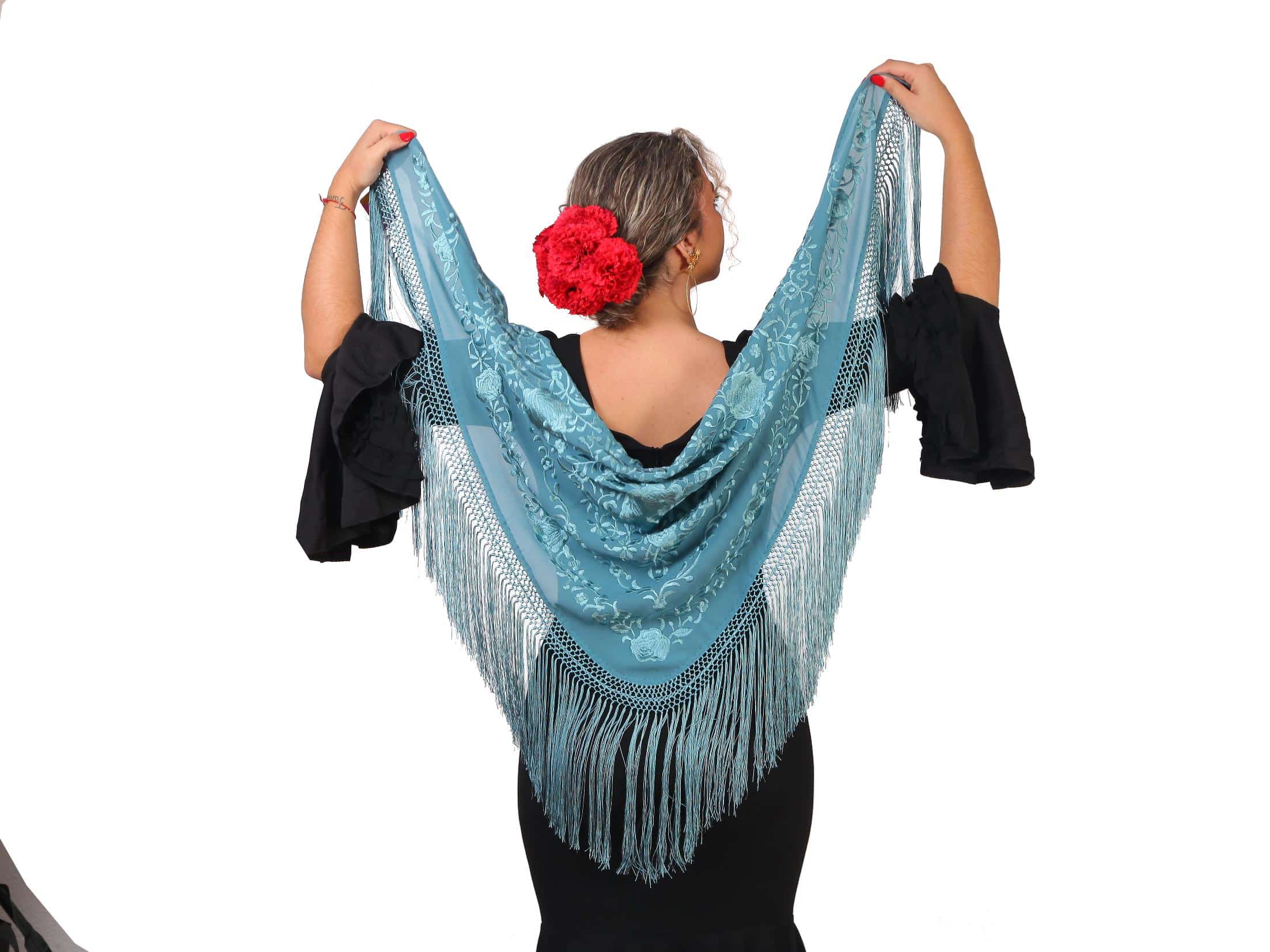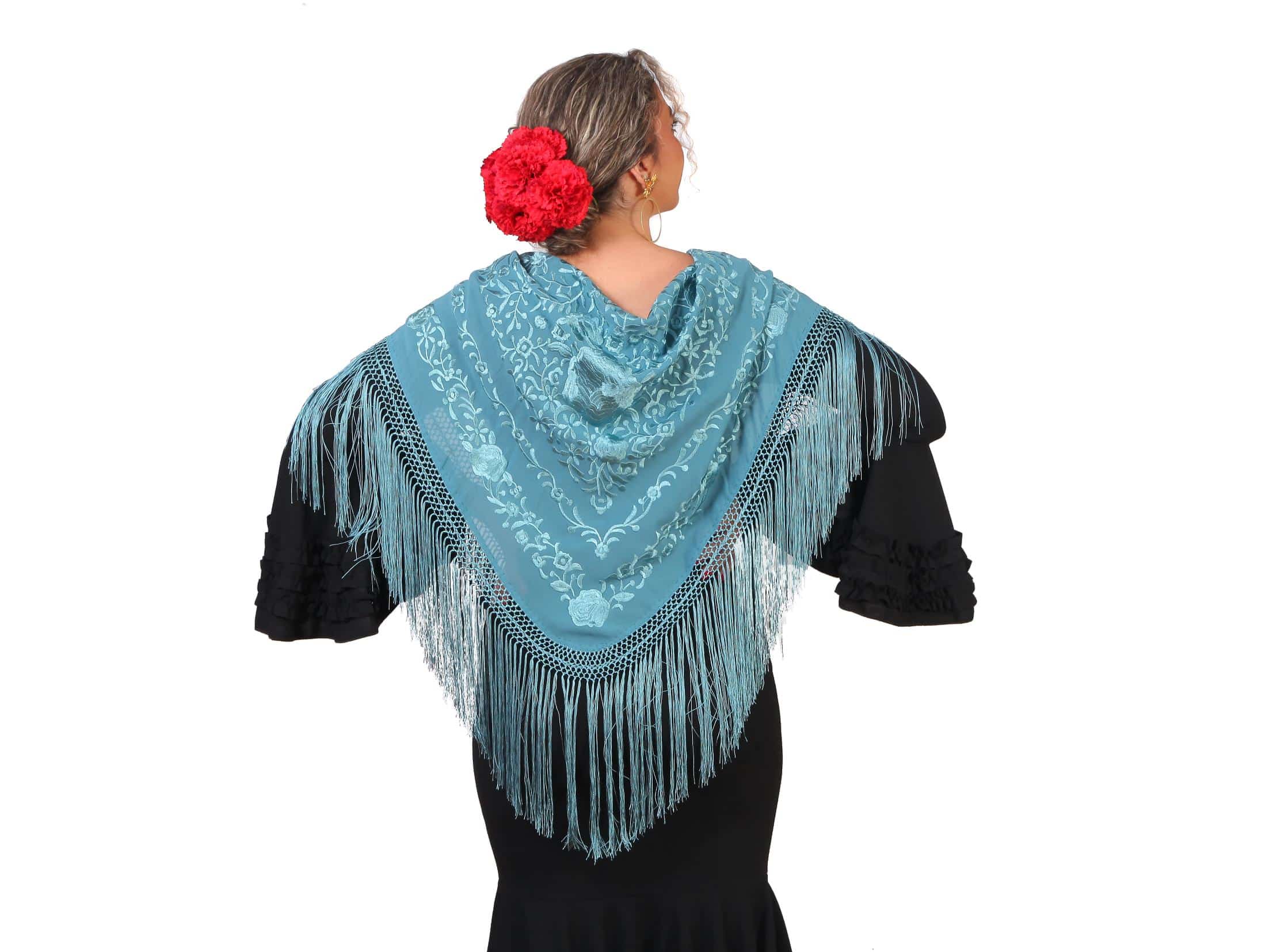 Mantón azul zafiro bordado en monocolor.Enrejado y flecado a mano con seda natural. Medidas 150x66cm aprox. (Sólo el mantón) más los flecos 30 cm (incluyendo el enrejado). Fabricado artesanalmente en la provincia de Sevilla.