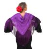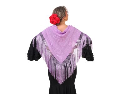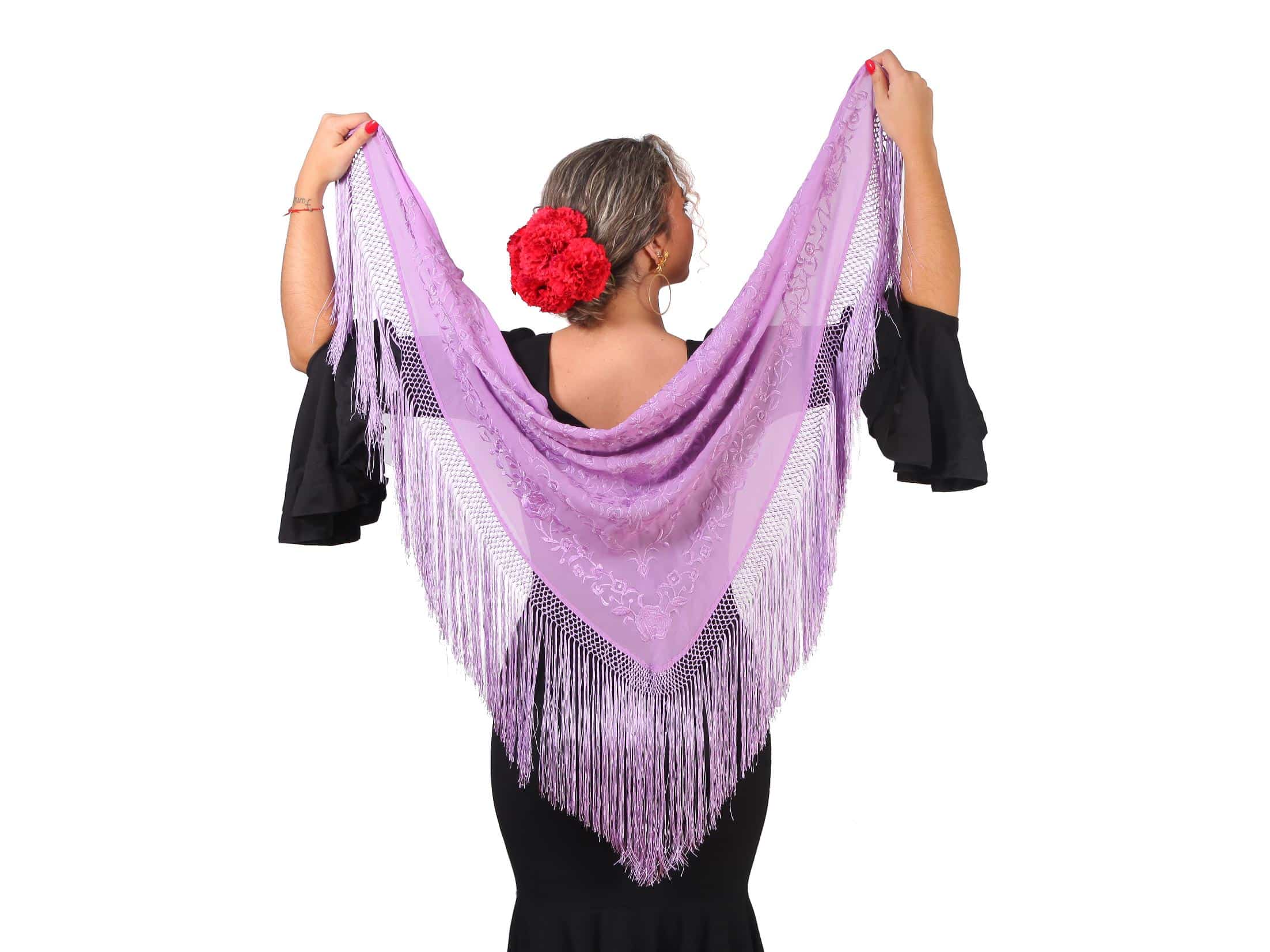 Mantón malva bordado en monocolor.Enrejado y flecado a mano con seda natural. Medidas 150x66cm aprox. (Sólo el mantón) más los flecos 30 cm (incluyendo el enrejado). Fabricado artesanalmente en la provincia de Sevilla.
