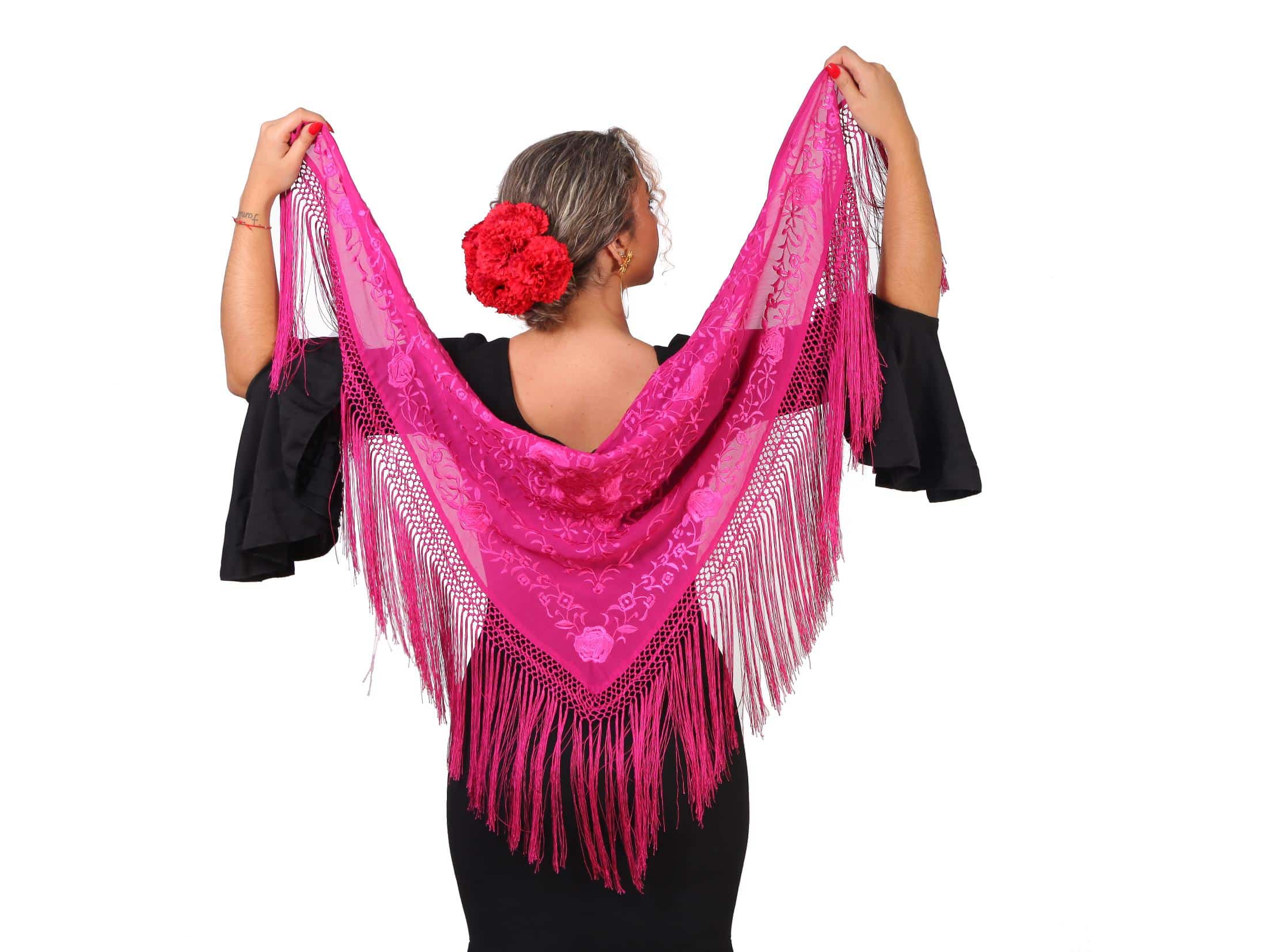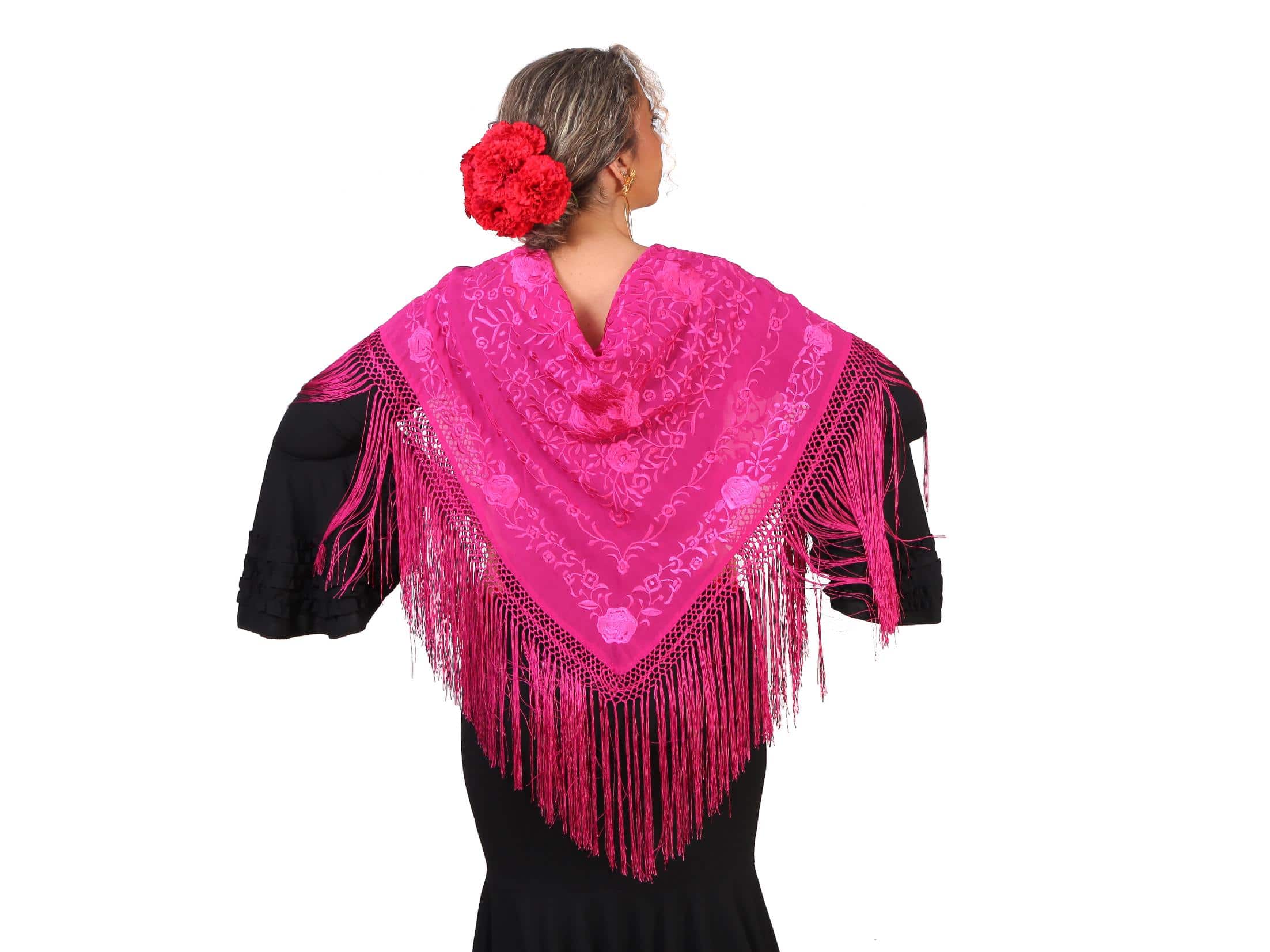 Mantón rosa frambuesa bordado en monocolor.Enrejado y flecado a mano con seda natural. Medidas 150x66cm aprox. (Sólo el mantón) más los flecos 30 cm (incluyendo el enrejado). Fabricado artesanalmente en la provincia de Sevilla.