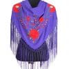 Mantón morado bordado en aguamarina pastel, enrejado y flecado a mano con seda natural. Medidas 135x60cm aprox. (Sólo el mantón) más los flecos 25 cm (incluyendo el enrejado). Fabricado artesanalmente en la provincia de Sevilla.
