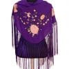 Mantón morado bordado en beige, enrejado y flecado a mano con seda natural. Medidas 135x60cm aprox. (Sólo el mantón) más los flecos 25 cm (incluyendo el enrejado). Fabricado artesanalmente en la provincia de Sevilla.