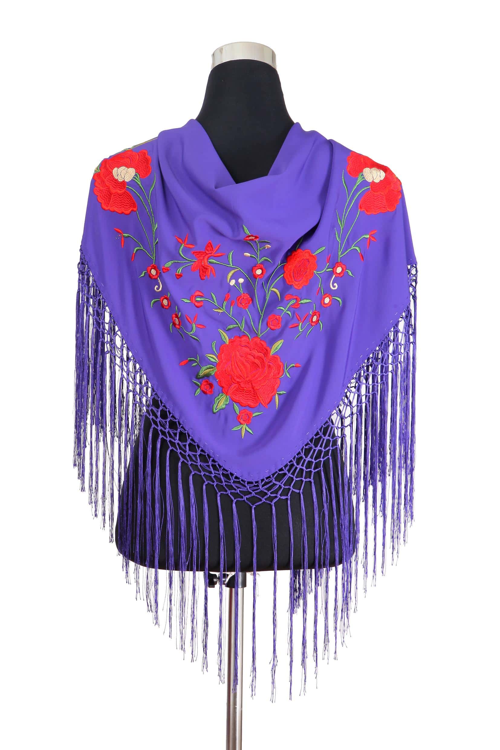 Mantón morado bordado en tonos rojo, enrejado y flecado a mano con seda natural. Medidas 135x60cm aprox. (Sólo el mantón) más los flecos 25 cm (incluyendo el enrejado). Fabricado artesanalmente en la provincia de Sevilla.