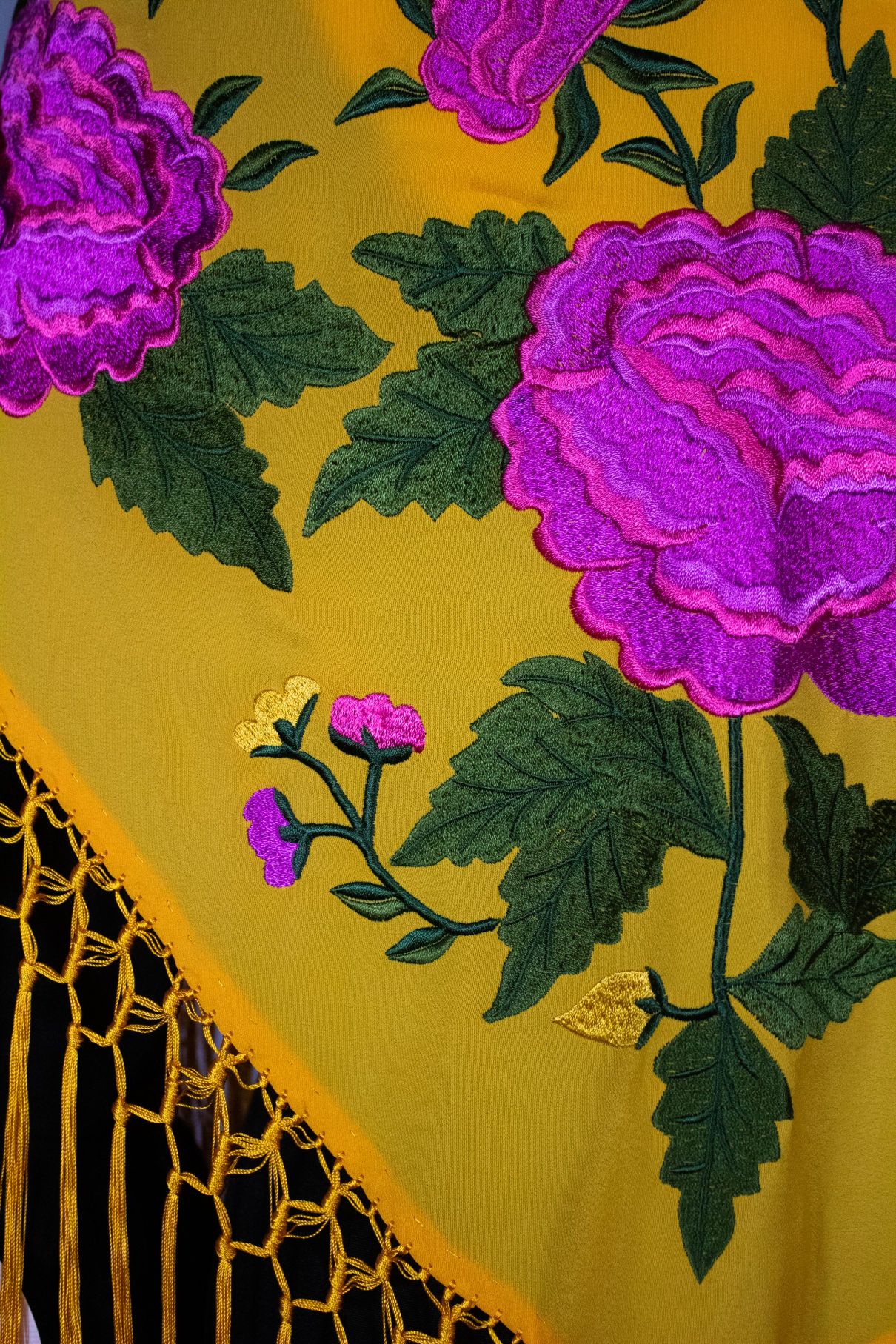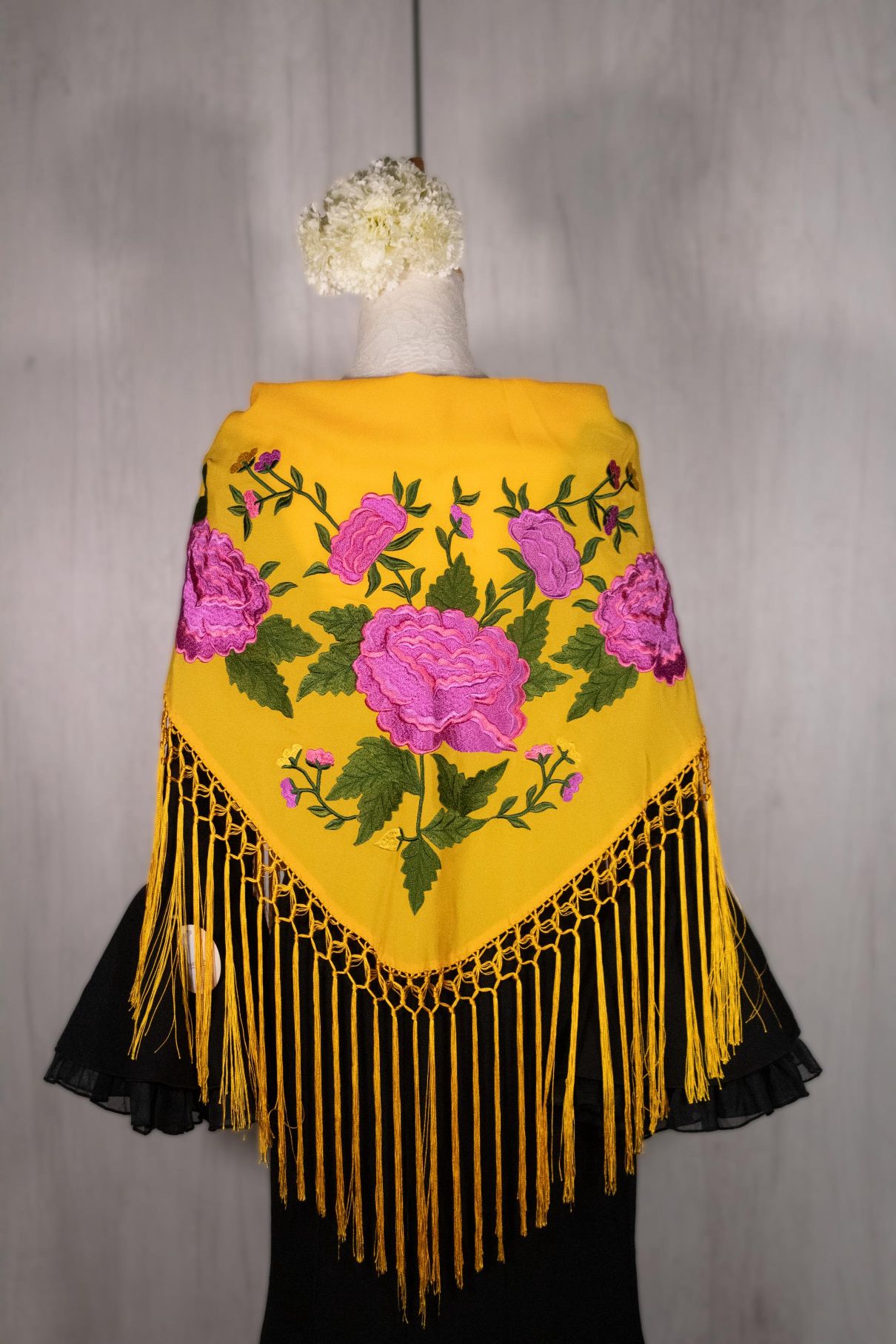 Mantón mostaza Andalucía bordado en tonos buganvilla y verde