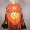 Mantón naranja bordado en multicolor, enrejado y flecado a mano con seda natural. Medidas 135x60cm aprox. (Sólo el mantón) más los flecos 25 cm (incluyendo el enrejado). Fabricado artesanalmente en la provincia de Sevilla.