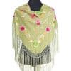 Mantón negro bordado en multicolor, enrejado y flecado a mano con seda natural. Medidas 135x60cm aprox. (Sólo el mantón) más los flecos 25 cm (incluyendo el enrejado). Fabricado artesanalmente en la provincia de Sevilla.