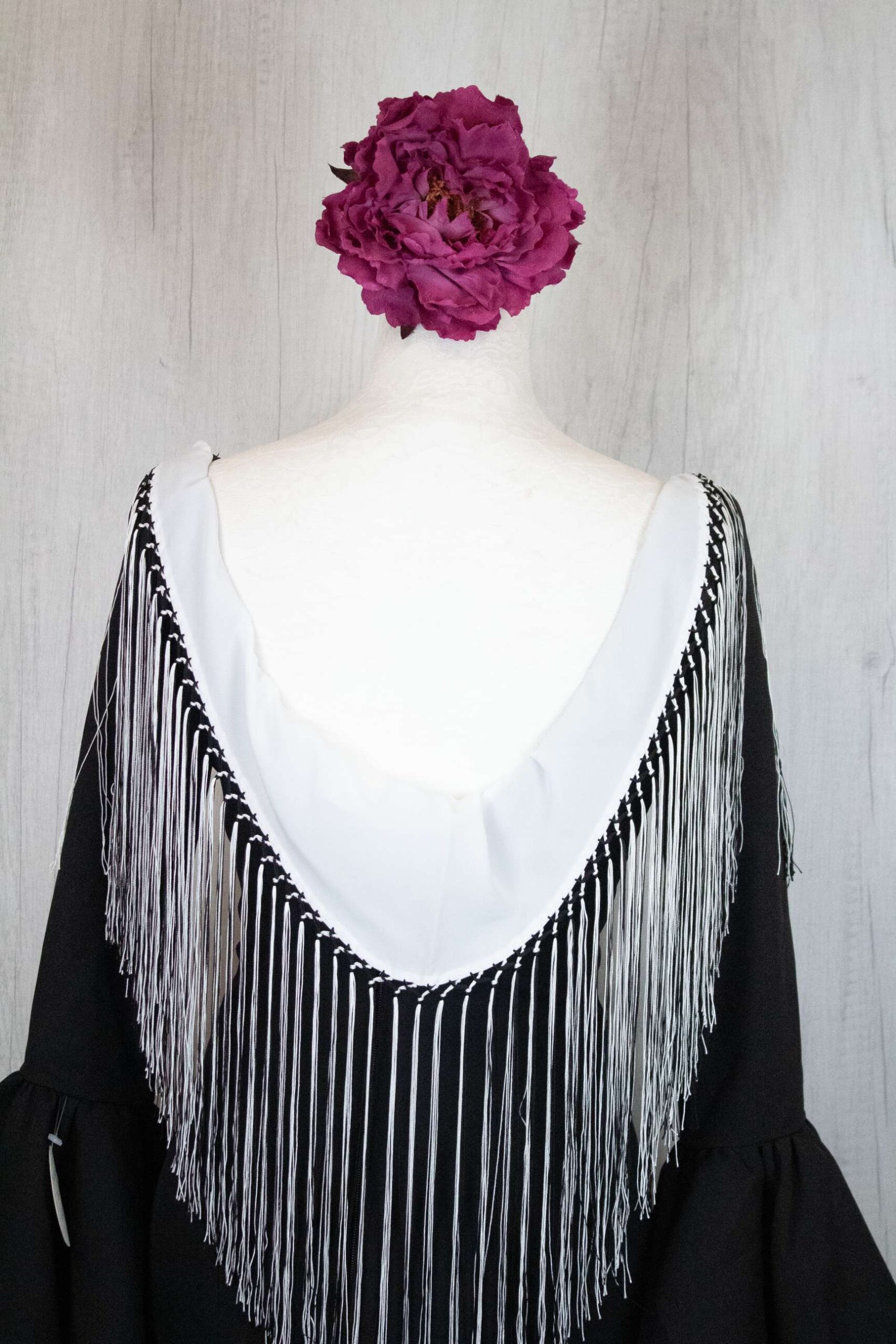 Mantón de niña blanco, acabado en fleco bicolor negro y blanco.