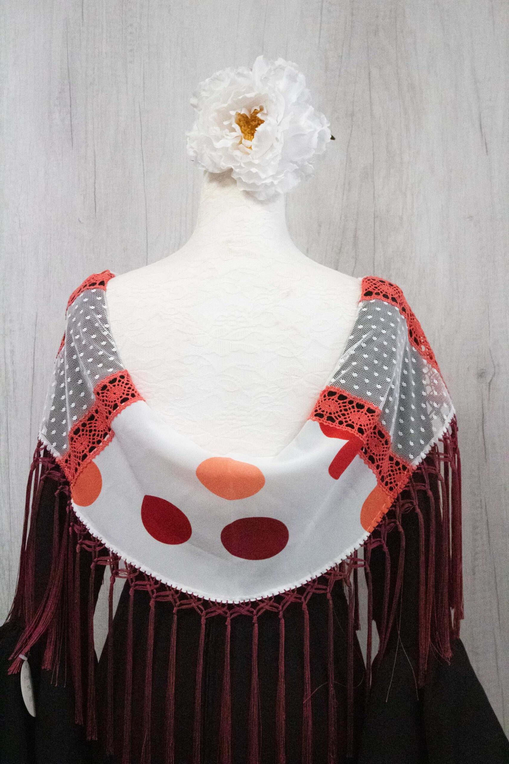 Mantón blanco con lunares corales, acabado en enrejado maquillaje oscuro