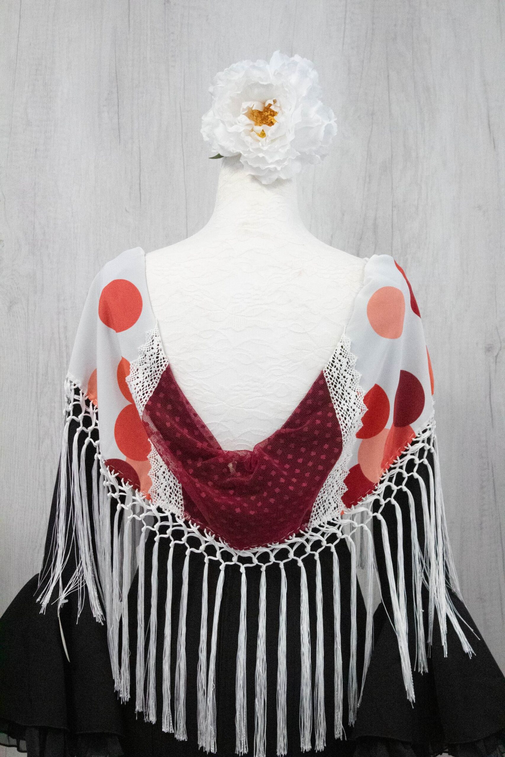 Mantón blanco de niña con lunares corales, plumeti burdeos, acabado en enrejado blanco