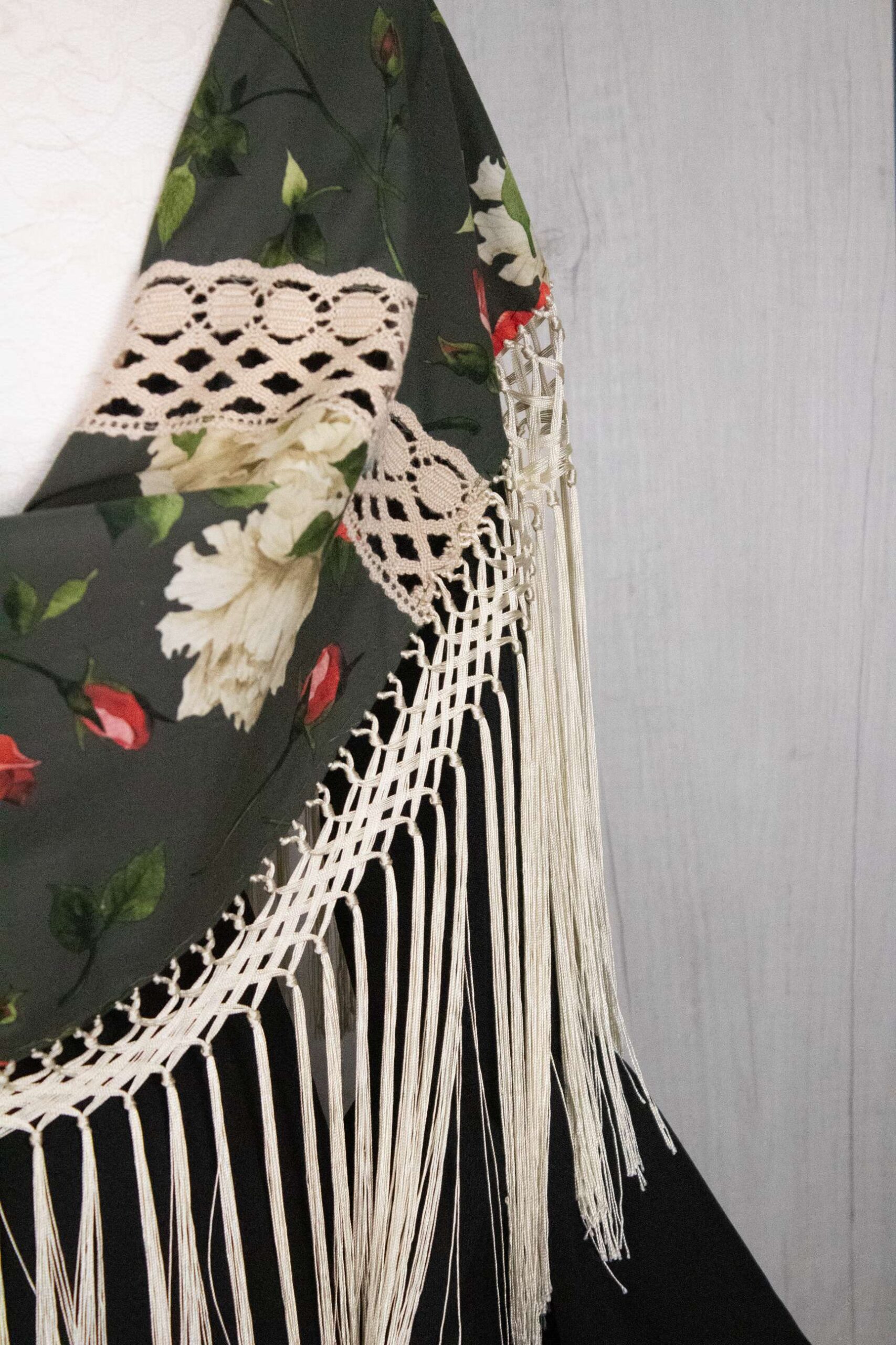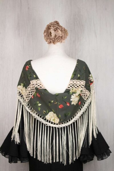 Mantón niña verde botella estampado de flores, acabado en enrejado marfil