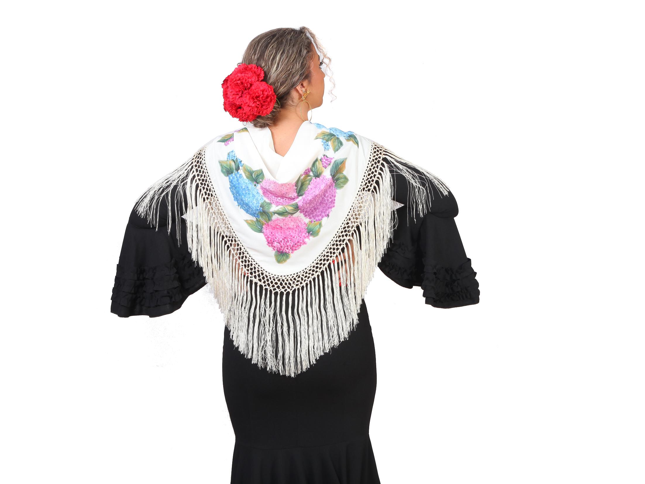 Mantón beige.Enrejado y flecado a mano con seda natural. Medidas 140x60cm aprox. (Sólo el mantón) más los flecos 28 cm (incluyendo el enrejado). Fabricado artesanalmente en la provincia de Sevilla.