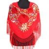 Mantón rojo bordado en multicolor. Medidas 135x60cm aprox. (Sólo el mantón) más los flecos 25 cm (incluyendo el enrejado). Fabricado artesanalmente en la provincia de Sevilla.