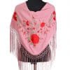 Mantón rosa bebé bordado en multicolor, enrejado y flecado a mano con seda natural. Medidas 135x60cm aprox. (Sólo el mantón) más los flecos 25 cm (incluyendo el enrejado). Fabricado artesanalmente en la provincia de Sevilla.