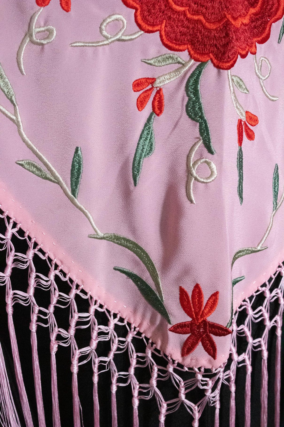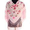 Mantón rosa bebé bordado en multicolor, predomina el rojo enrejado y flecado a mano con seda natural. Medidas 135x60cm aprox. (Sólo el mantón) más los flecos 25 cm (incluyendo el enrejado). Fabricado artesanalmente en la provincia de Sevilla.