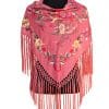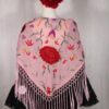 Mantón rosa bebé bordado en multicolor, enrejado y flecado a mano con seda natural. Medidas 135x60cm aprox. (Sólo el mantón) más los flecos 25 cm (incluyendo el enrejado). Fabricado artesanalmente en la provincia de Sevilla.