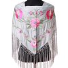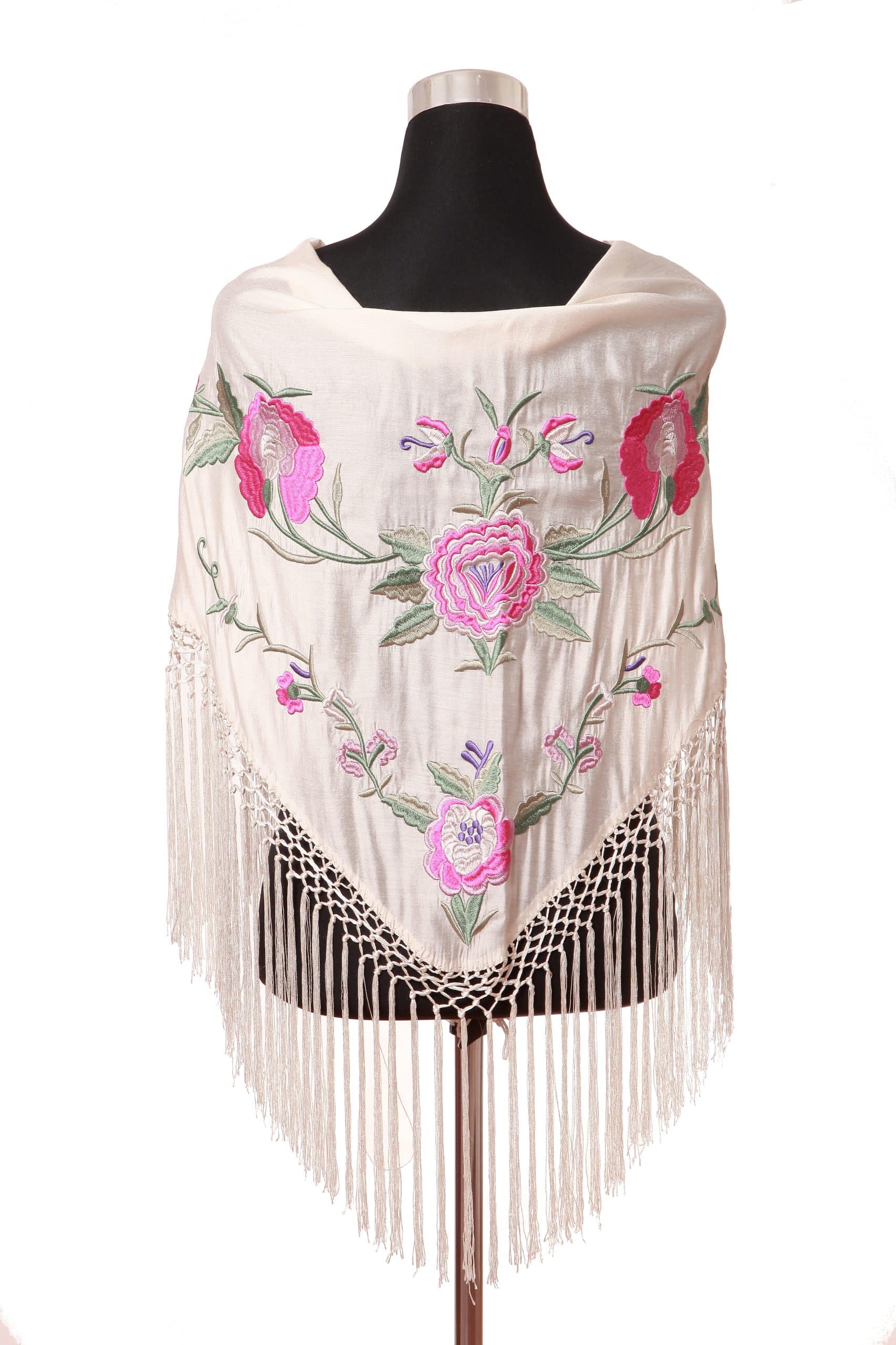 Mantón color beige bordado en multicolor de algodón flecado en mano con borlón en seda y enrejado en seda natural. Medidas 135x60cm aprox. (Sólo el mantón) más los flecos 25 cm (incluyendo el enrejado). Fabricado artesanalmente en la provincia de Sevilla.