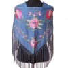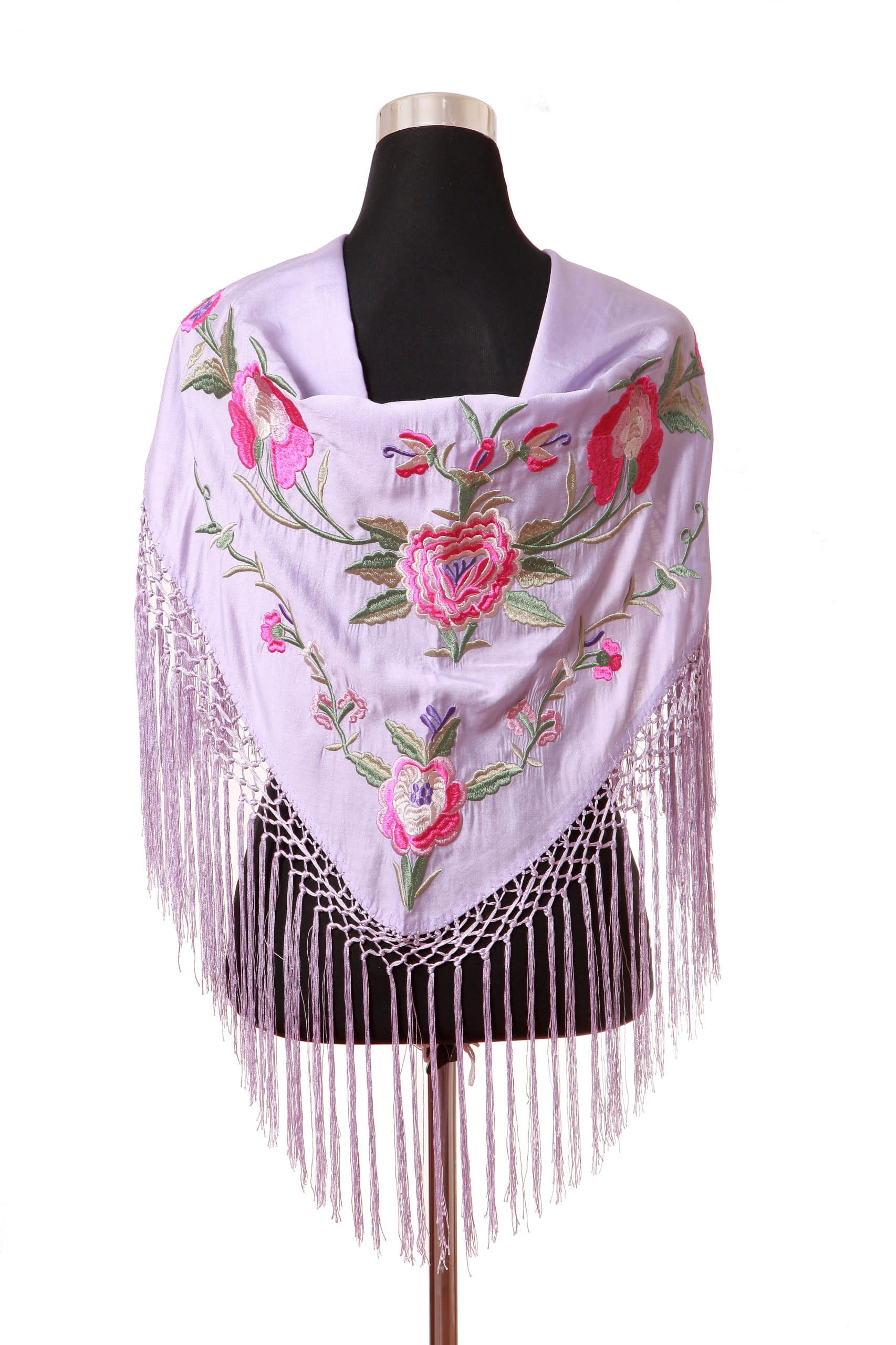 Mantón color lila bordado en multicolor de algodón flecado en mano con borlón en seda y enrejado en seda natural. Medidas 135x60cm aprox. (Sólo el mantón) más los flecos 25 cm (incluyendo el enrejado). Fabricado artesanalmente en la provincia de Sevilla.