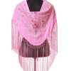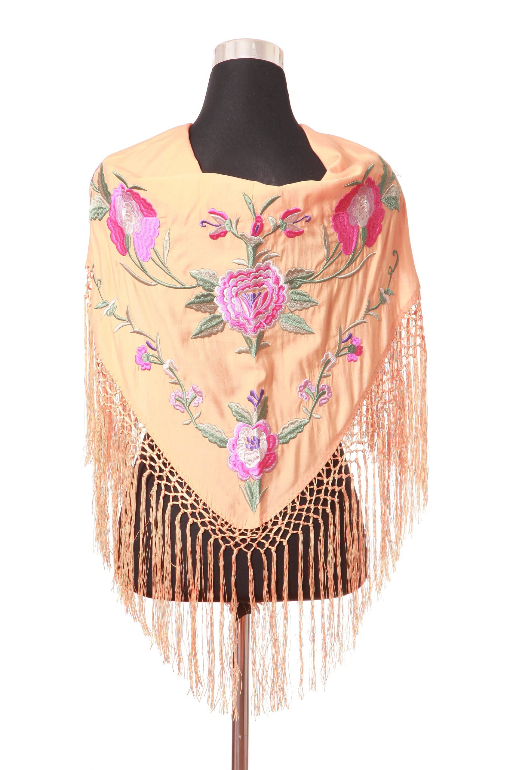 Mantón color amarillo bordado en multicolor de algodón flecado en mano con borlón en seda y enrejado en seda natural. Medidas 135x60cm aprox. (Sólo el mantón) más los flecos 25 cm (incluyendo el enrejado). Fabricado artesanalmente en la provincia de Sevilla.