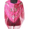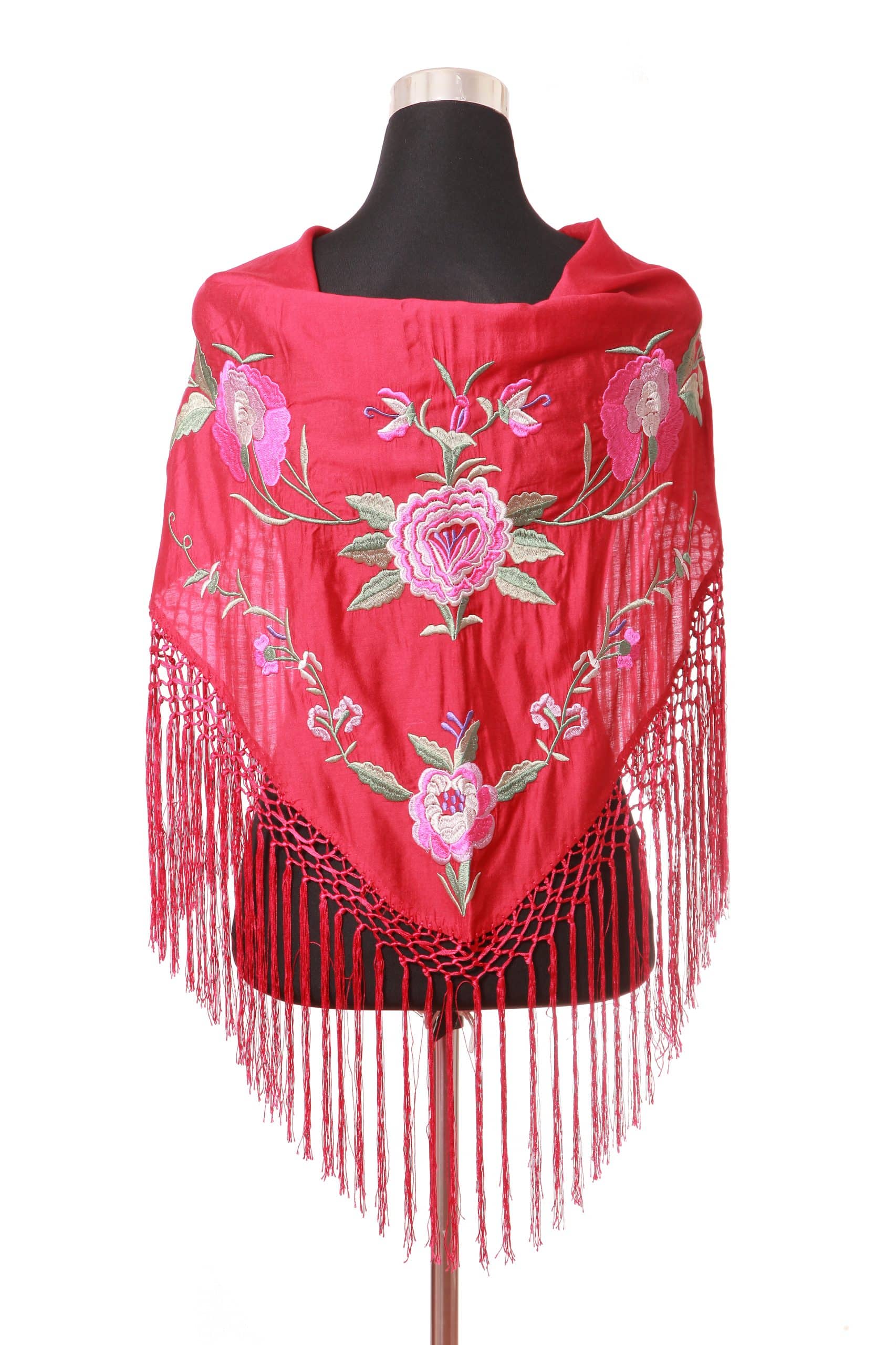 Mantón color rojo bordado en multicolor de algodón flecado en mano con borlón en seda y enrejado en seda natural. Medidas 135x60cm aprox. (Sólo el mantón) más los flecos 25 cm (incluyendo el enrejado). Fabricado artesanalmente en la provincia de Sevilla.