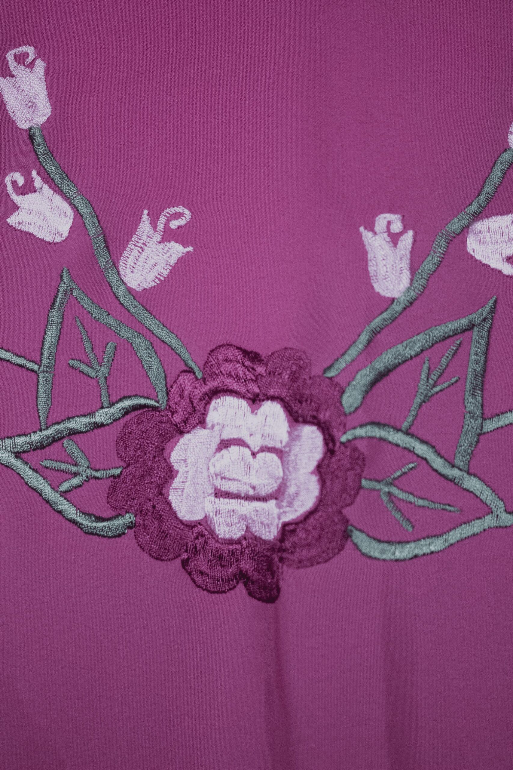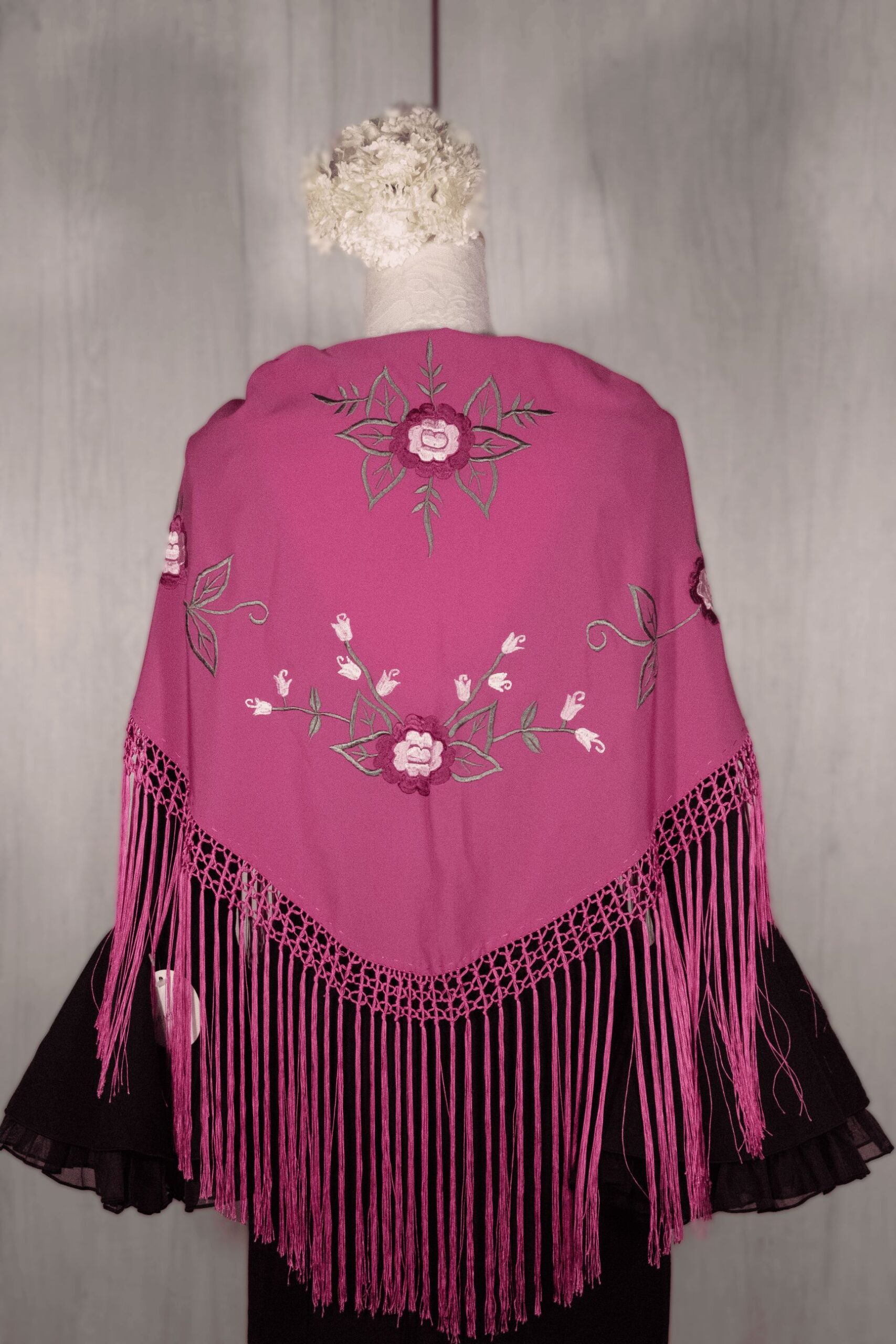 Mantón rosa fucsia bordado en multicolor, enrejado y flecado a mano con seda natural. Medidas 135x60cm aprox. (Sólo el mantón) más los flecos 25 cm (incluyendo el enrejado). Fabricado artesanalmente en la provincia de Sevilla.