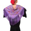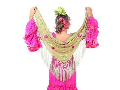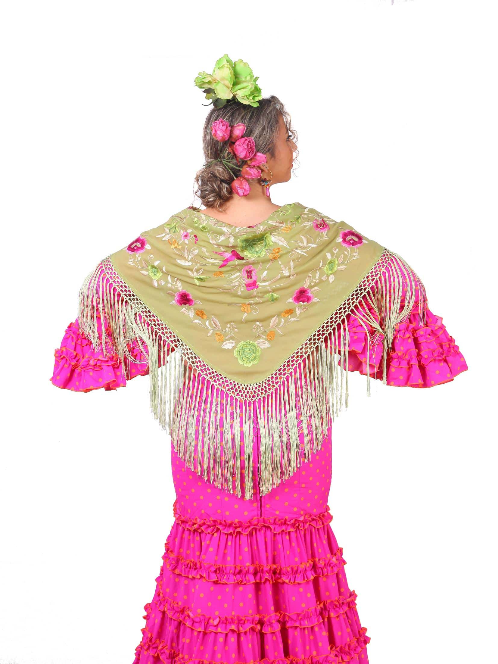 Mantón verde bordado en multicolor, enrejado y flecado a mano con seda natural. Medidas 135x60cm aprox. (Sólo el mantón) más los flecos 25 cm (incluyendo el enrejado). Fabricado artesanalmente en la provincia de Sevilla.