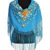Mantón turquesa bordado en multicolor, enrejado y flecado a mano con seda natural. Medidas 135x60cm aprox. (Sólo el mantón) más los flecos 25 cm (incluyendo el enrejado). Fabricado artesanalmente en la provincia de Sevilla.