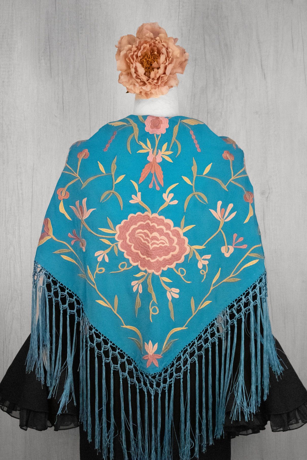 Mantón turquesa bordado en multicolor, enrejado y flecado a mano con seda natural. Medidas 135x60cm aprox. (Sólo el mantón) más los flecos 25 cm (incluyendo el enrejado). Fabricado artesanalmente en la provincia de Sevilla.