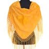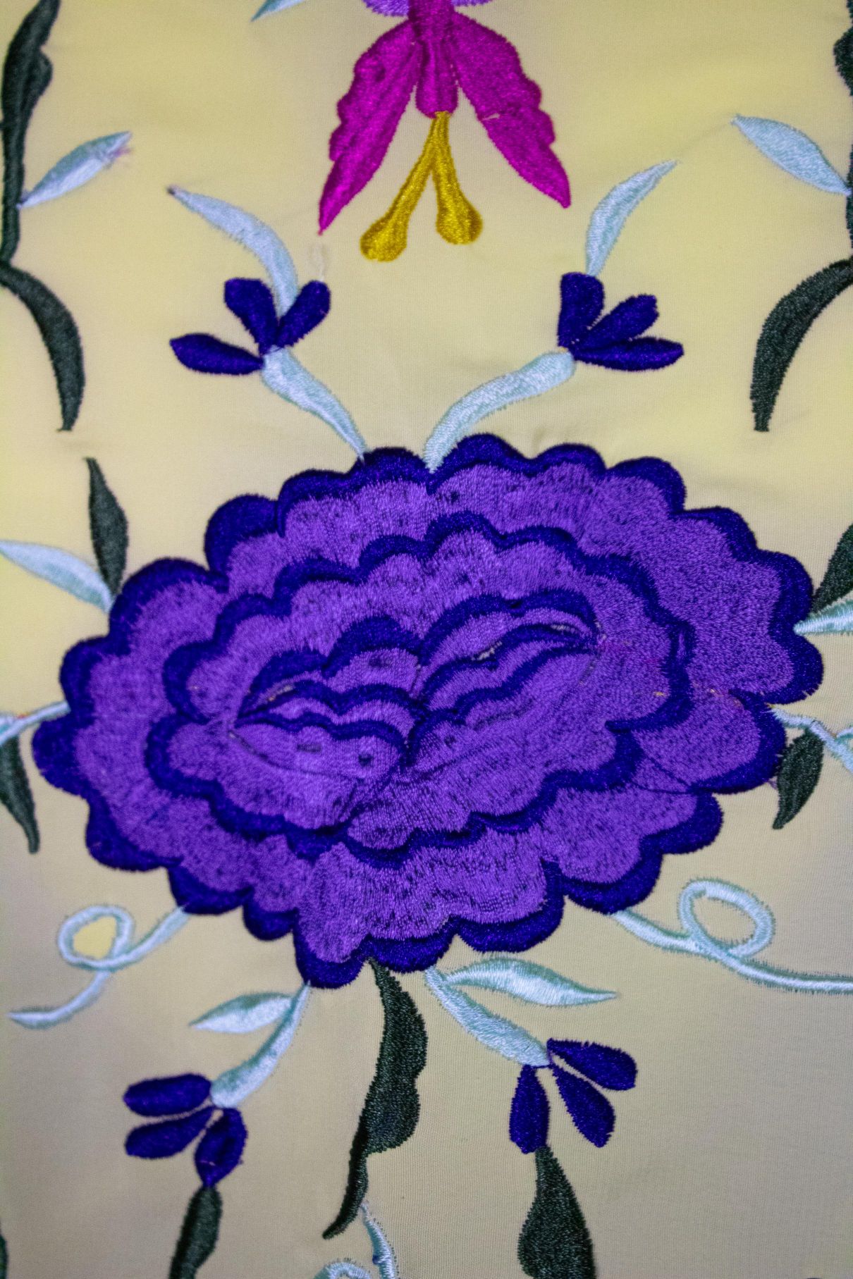 Mantón vainilla bordado en tonos morados y multicolor, enrejado y flecado a mano con seda natural. Medidas 135x60cm aprox. (Sólo el mantón) más los flecos 25 cm (incluyendo el enrejado). Fabricado artesanalmente en la provincia de Sevilla.