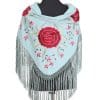 Mantón verde jabonoso bordado en beige, enrejado y flecado a mano con seda natural. Medidas 135x60cm aprox. (Sólo el mantón) más los flecos 25 cm (incluyendo el enrejado). Fabricado artesanalmente en la provincia de Sevilla.