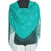 Mantón verde jabonoso bordado en el mismo color, enrejado y flecado a mano con seda natural. Medidas 135x60cm aprox. (Sólo el mantón) más los flecos 25 cm (incluyendo el enrejado). Fabricado artesanalmente en la provincia de Sevilla.
