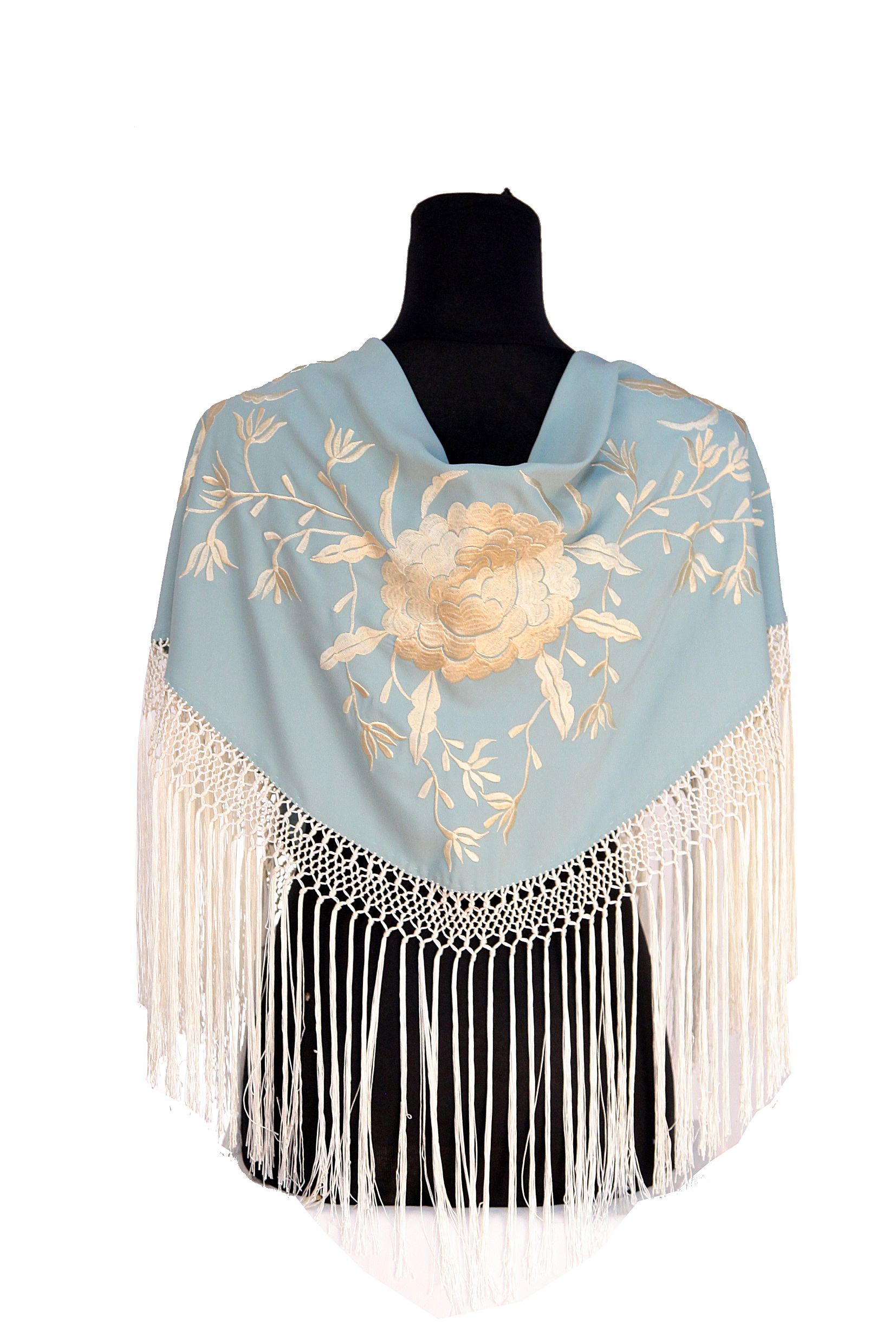 Mantón verde jabonoso bordado en marfil y flecos marfil
