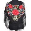 Mantón verde jabonoso bordado en multicolor, enrejado y flecado a mano con seda natural. Medidas 135x60cm aprox. (Sólo el mantón) más los flecos 25 cm (incluyendo el enrejado). Fabricado artesanalmente en la provincia de Sevilla.