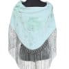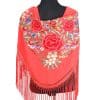 Mantón verde jabonoso bordado en multicolor, enrejado y flecado a mano con seda natural. Medidas 135x60cm aprox. (Sólo el mantón) más los flecos 25 cm (incluyendo el enrejado). Fabricado artesanalmente en la provincia de Sevilla.