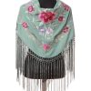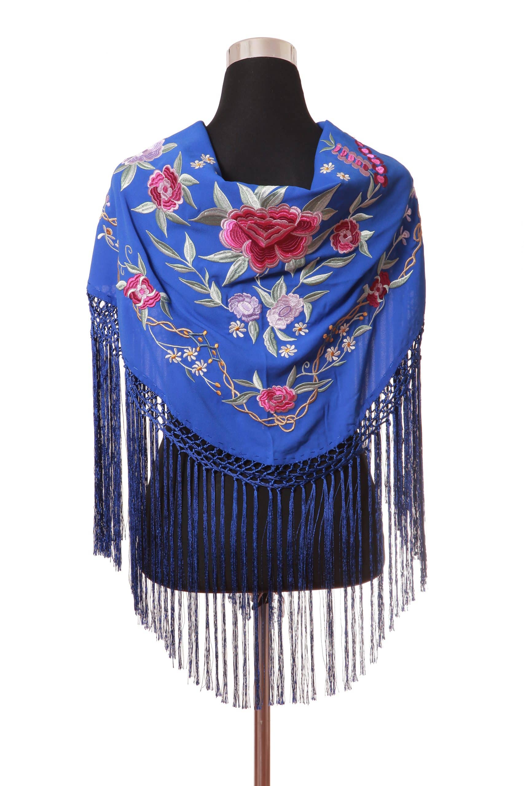 Mantón color azul azafata bordado en multicolor de algodón flecado en mano con borlón en seda y enrejado en seda natural. Medidas 135x60cm aprox. (Sólo el mantón) más los flecos 25 cm (incluyendo el enrejado). Fabricado artesanalmente en la provincia de Sevilla.