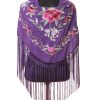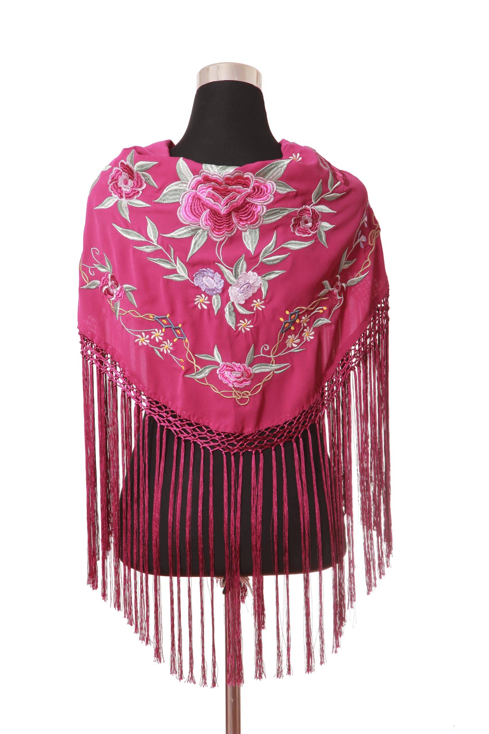 Mantón color buganvilla bordado en multicolor de algodón flecado en mano con borlón en seda y enrejado en seda natural. Medidas 135x60cm aprox. (Sólo el mantón) más los flecos 25 cm (incluyendo el enrejado). Fabricado artesanalmente en la provincia de Sevilla.