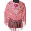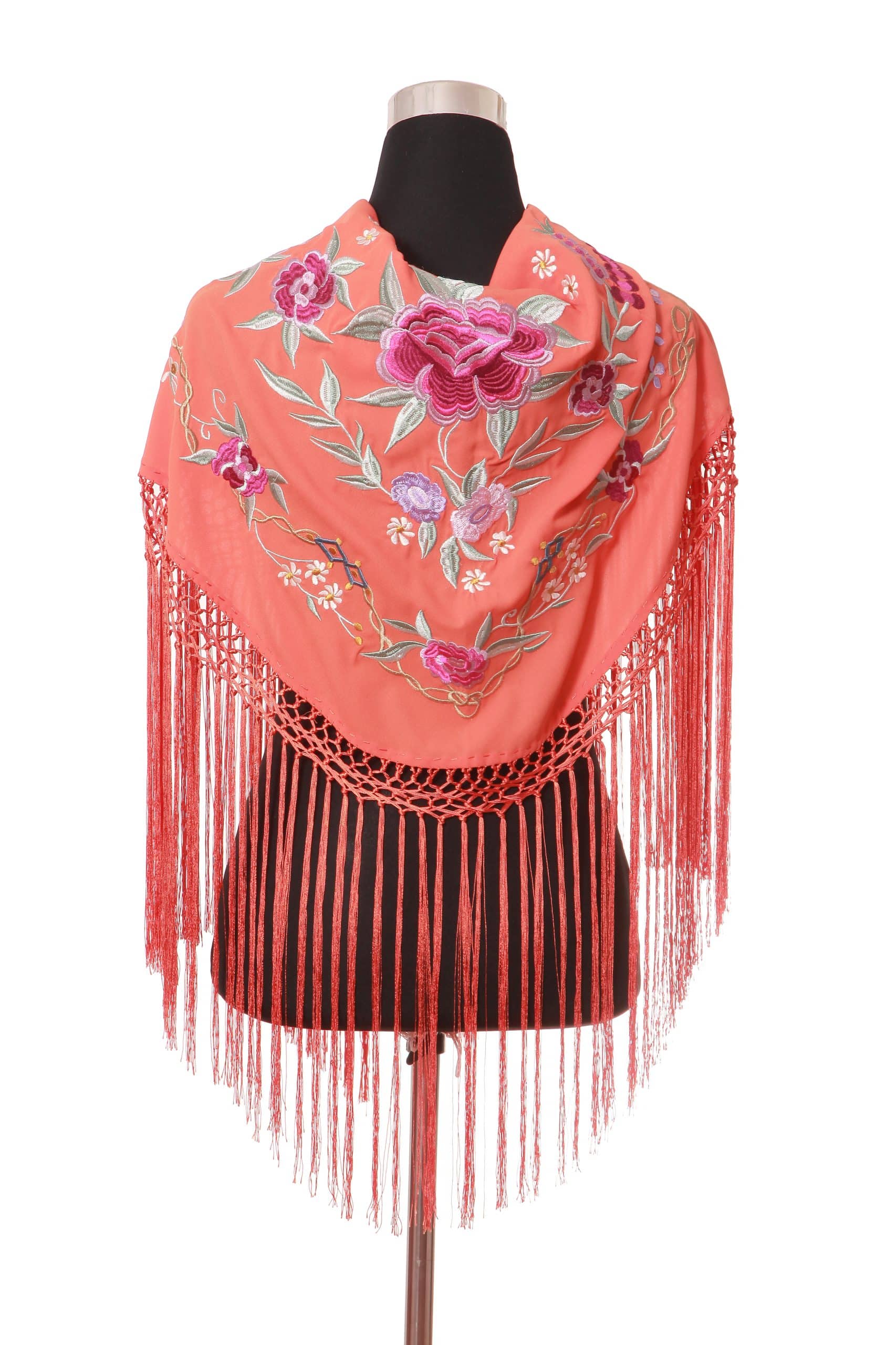 Mantón color coral bordado en multicolor de algodón flecado en mano con borlón en seda y enrejado en seda natural. Medidas 135x60cm aprox. (Sólo el mantón) más los flecos 25 cm (incluyendo el enrejado). Fabricado artesanalmente en la provincia de Sevilla.
