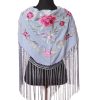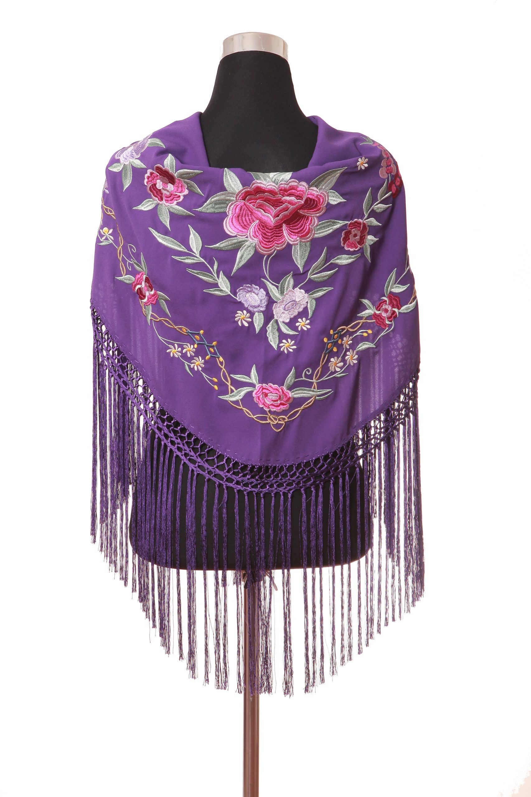 Mantón color morado bordado en multicolor de algodón flecado en mano con borlón en seda y enrejado en seda natural. Medidas 135x60cm aprox. (Sólo el mantón) más los flecos 25 cm (incluyendo el enrejado). Fabricado artesanalmente en la provincia de Sevilla.