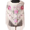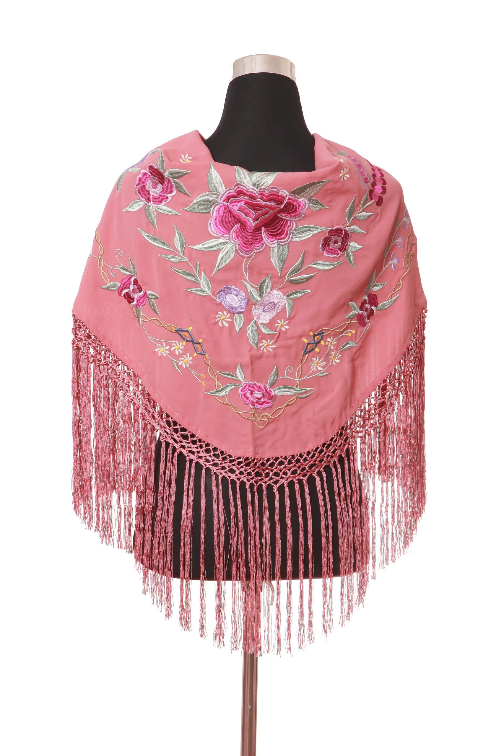 Mantón color rosa empolvado bordado en multicolor de algodón flecado en mano con borlón en seda y enrejado en seda natural. Medidas 135x60cm aprox. (Sólo el mantón) más los flecos 25 cm (incluyendo el enrejado). Fabricado artesanalmente en la provincia de Sevilla.