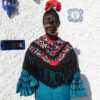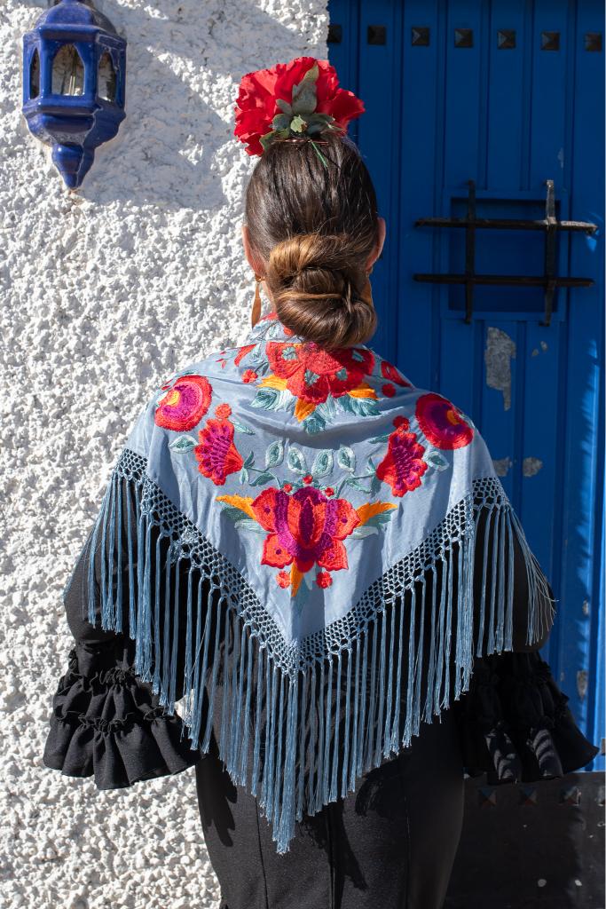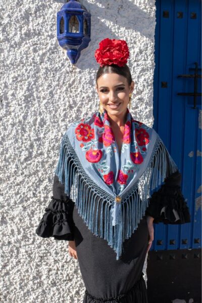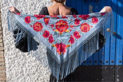 Mantón ducado claro de seda con bordado en hilo de seda multicolor con un espectacular diseño de flores. Enrejado y flecado a mano en seda 100% natural en la provincia de Sevilla.