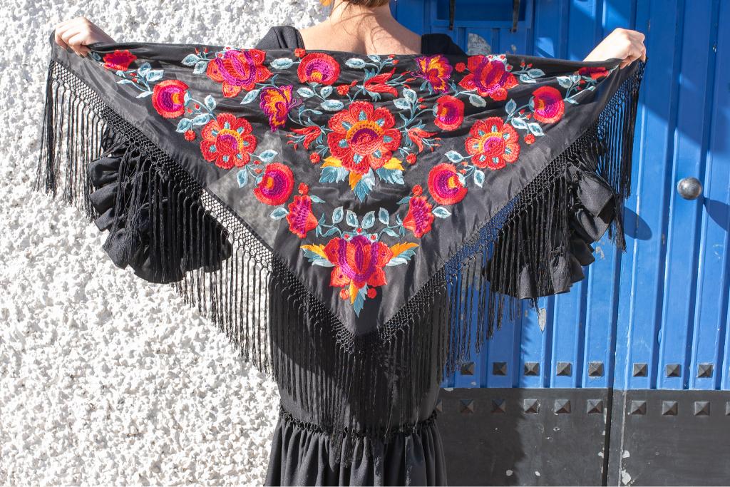 Mantón negro de seda con bordado en hilo de seda multicolor con un espectacular diseño de flores. Enrejado y flecado a mano en seda 100% natural en la provincia de Sevilla.