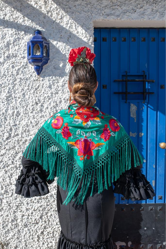 Mantón verde petróleo de seda con bordado en hilo de seda multicolor con un espectacular diseño de flores. Enrejado y flecado a mano en seda 100% natural en la provincia de Sevilla.