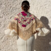Mantón azul ducado de seda con bordado en hilo de seda al tono con un espectacular diseño de flores. Enrejado y flecado a mano en seda 100% natural en la provincia de Sevilla.