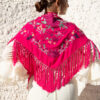 Mantón morado de seda con bordado en hilo de seda al tono con un espectacular diseño de flores. Enrejado y flecado a mano en seda 100% natural en la provincia de Sevilla.